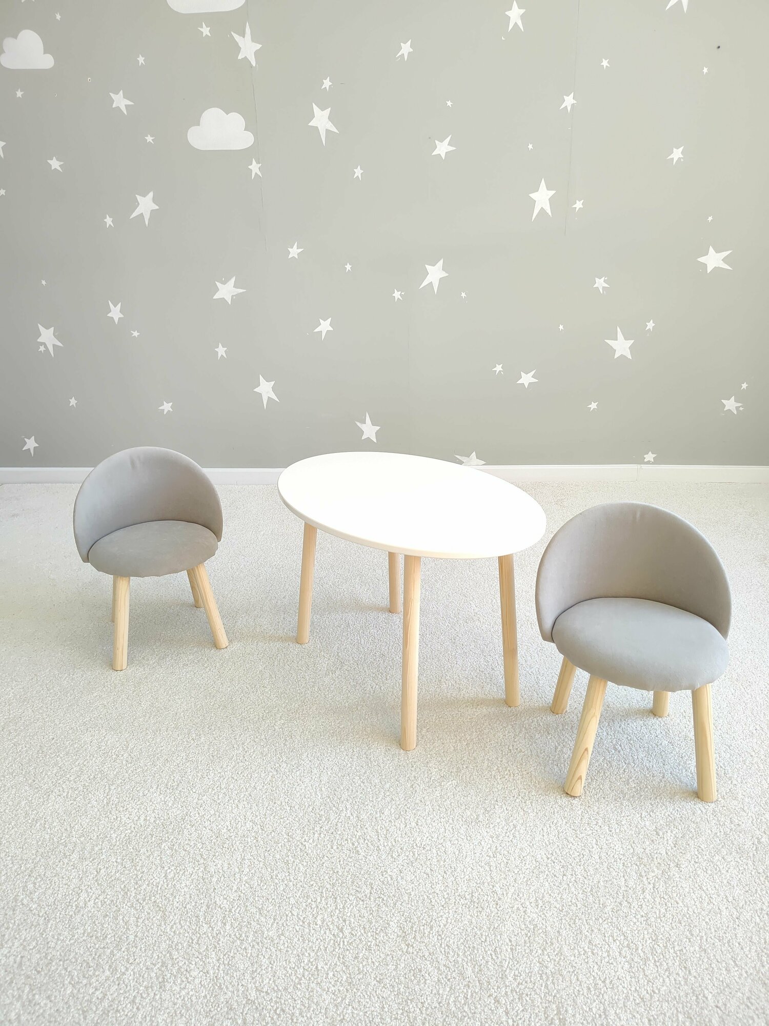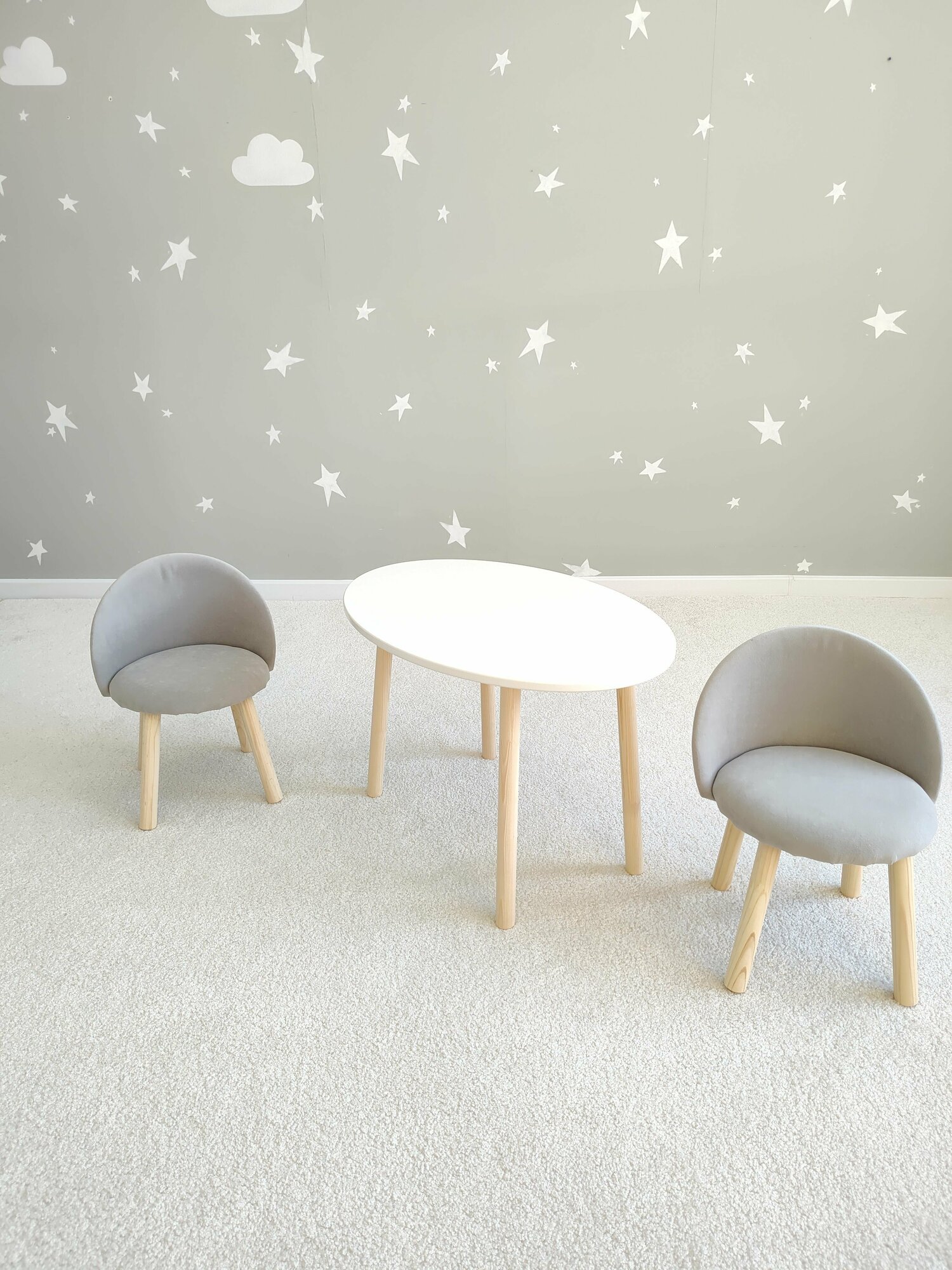 Стол облако белый и два мягких стула серых