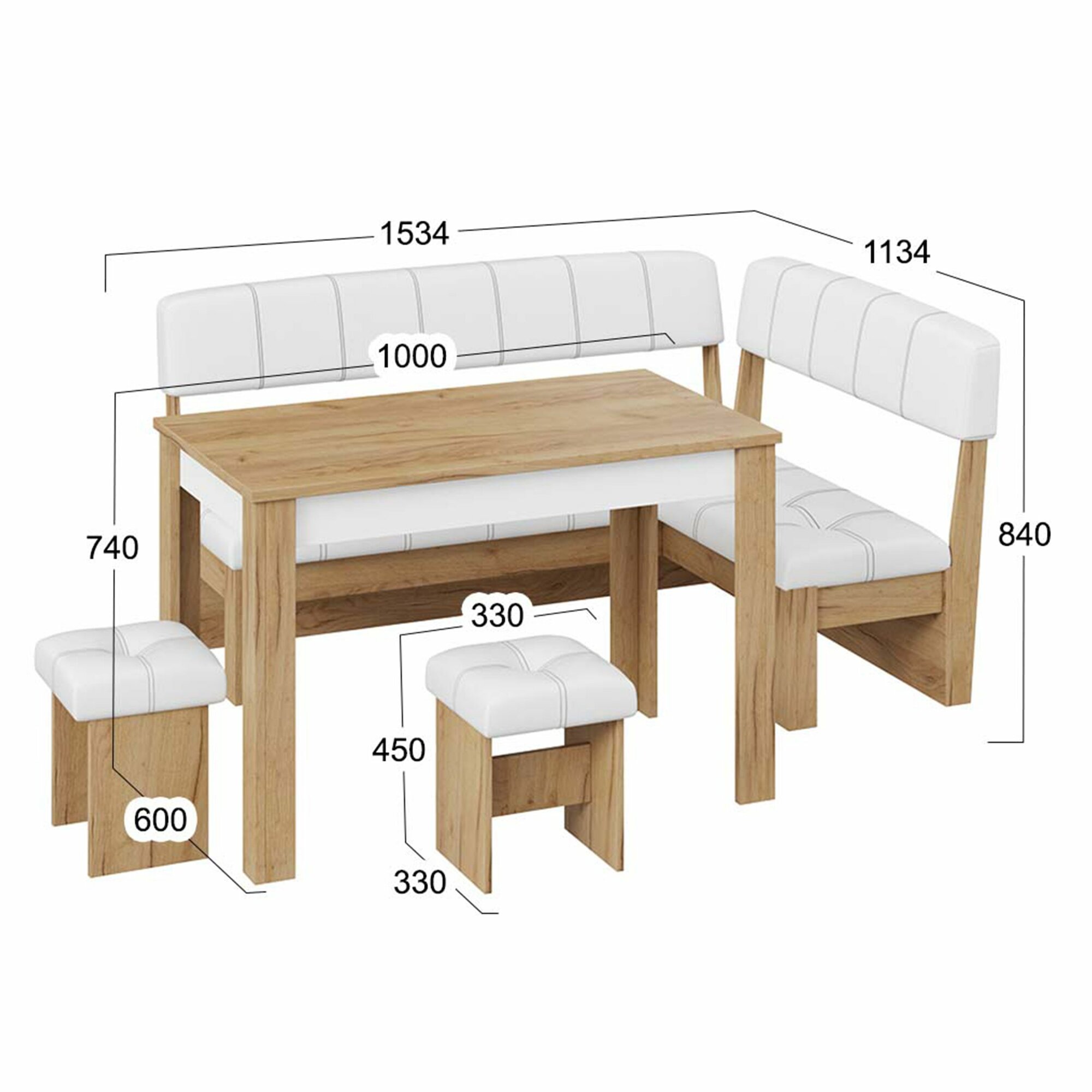 | Комплектация | Угловой диван - 1 шт, стол - 1 шт, табуреты - 2 шт |
