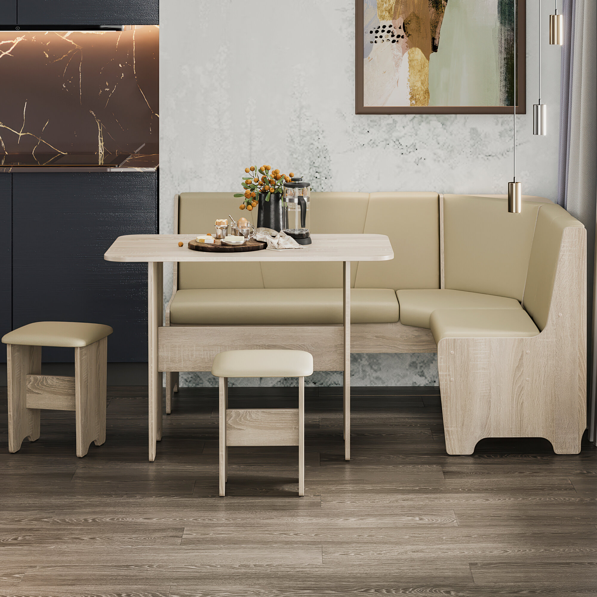 Кухонный уголок со столом и табуретками, кухонный диван с ящиками бежевый, Техас