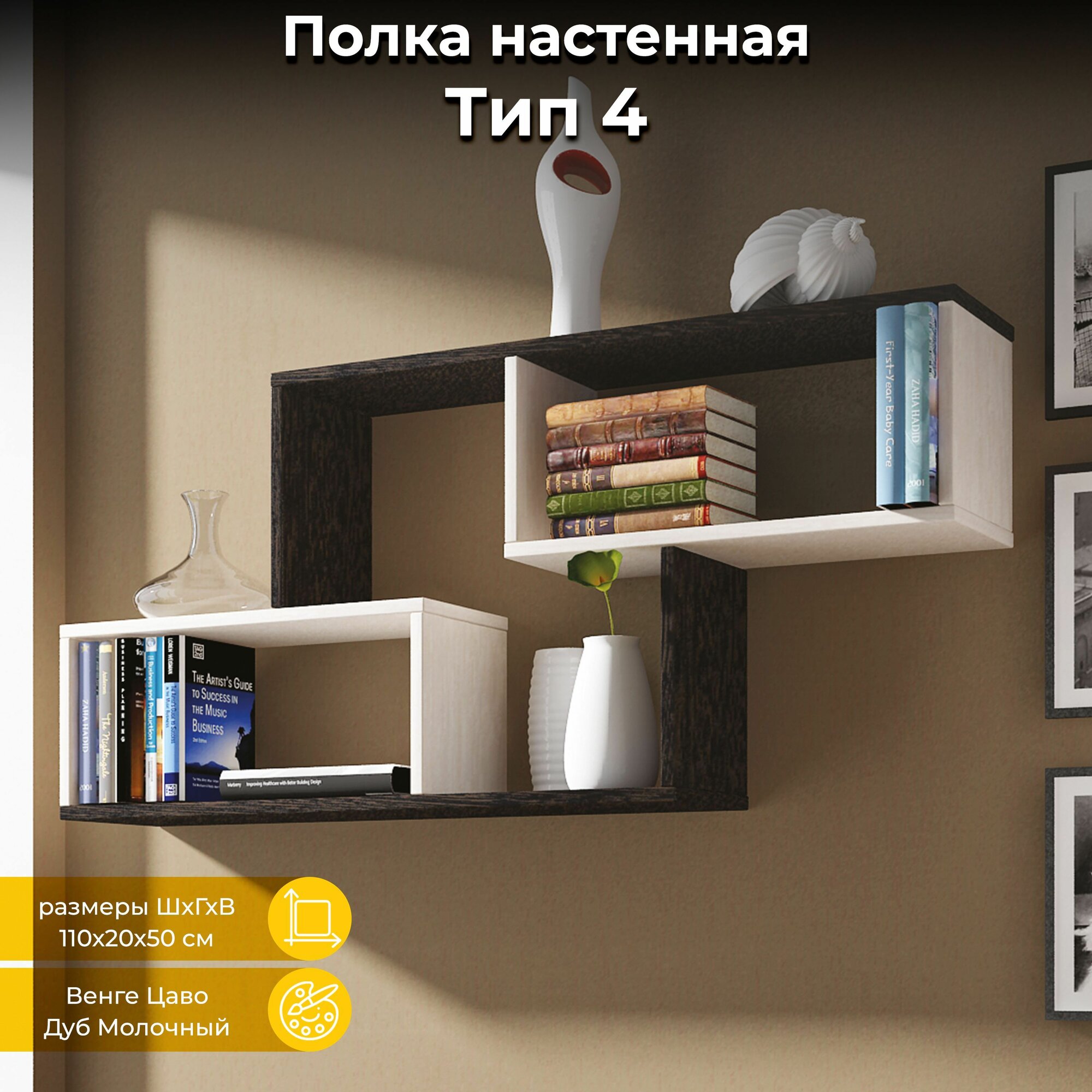 Полка настенная, прямая, интерьерная тип 4 (Венге цава/дуб молочный) интересное: