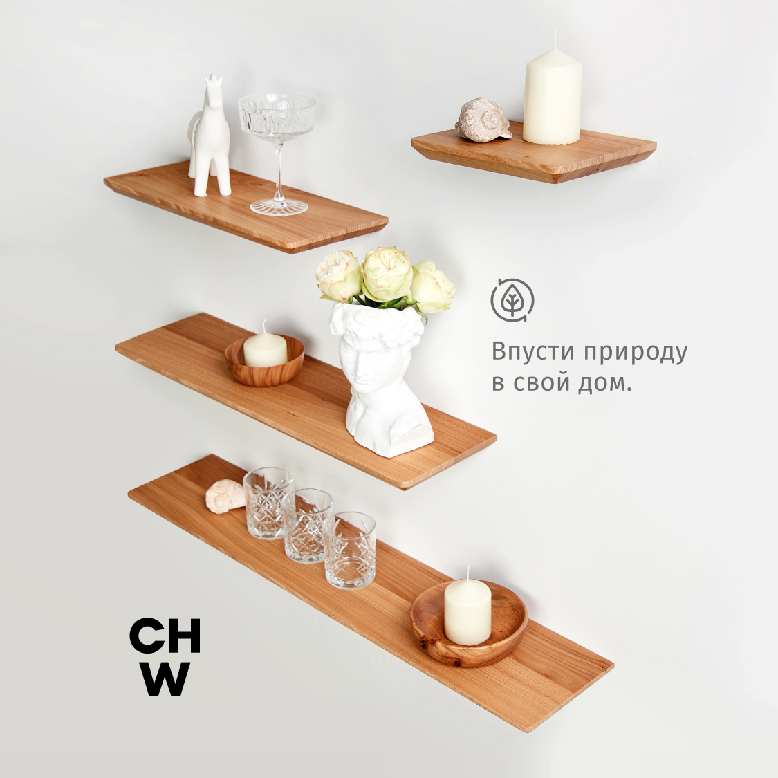 Полка настенная Choodwood 30-40см, подвесная, массив дерева карагач, скрытое крепление