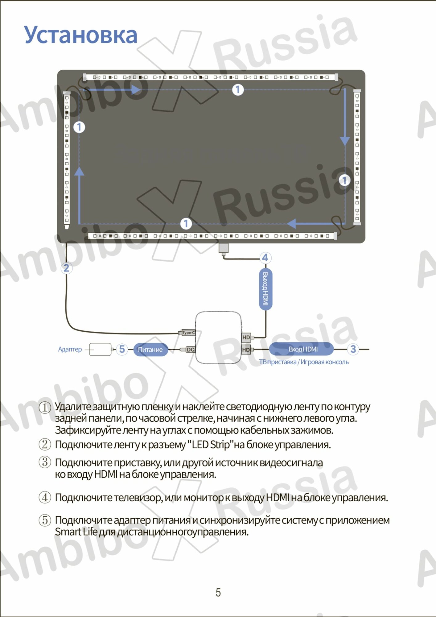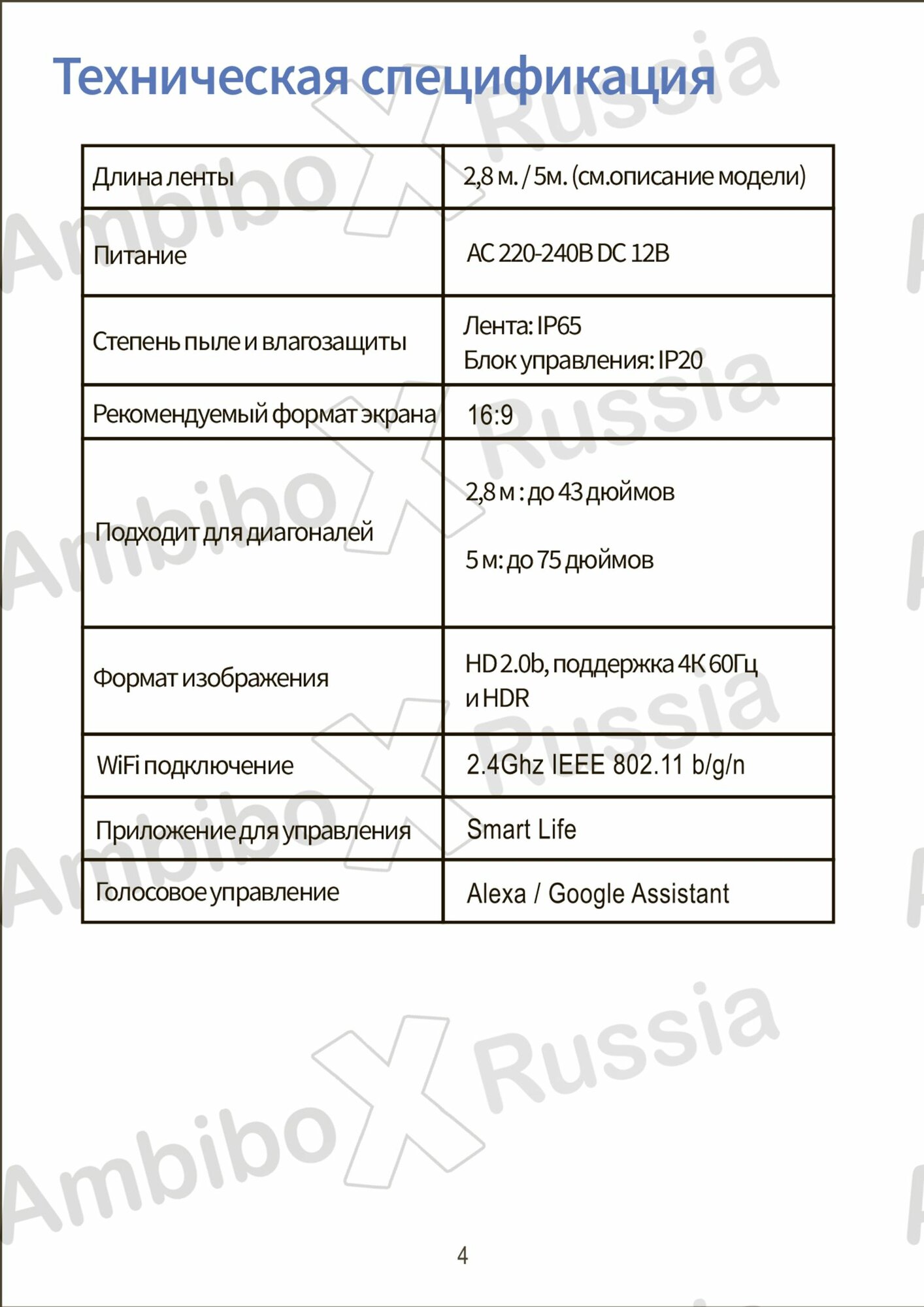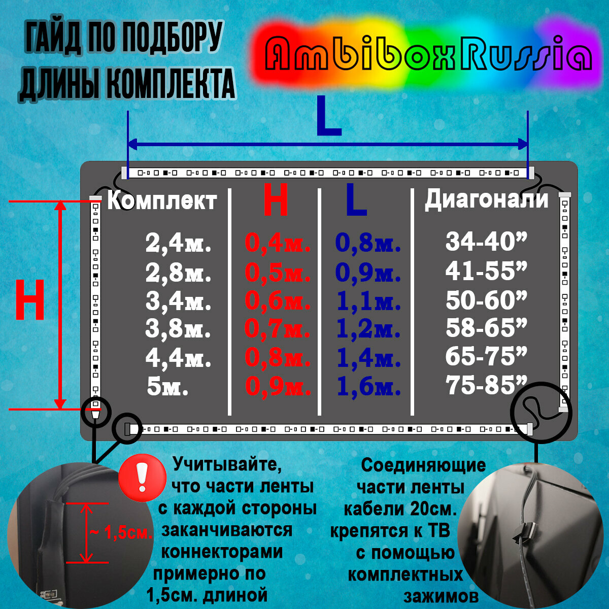 | Комплектация | Светодиодная лента (длина 4,4 м), компактный блок управления, адаптер питания 12В, инструкция по установке и настройке, HDMI кабель 1,5м., кабельные зажимы. |