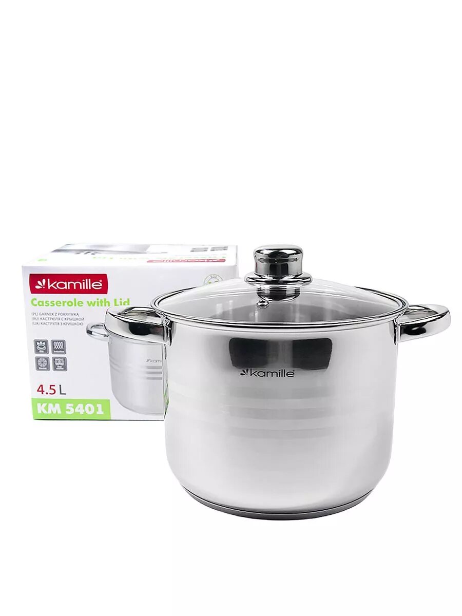 Кастрюля 4,5 л. из нержавеющей стали Kamille KM 5401 со стеклянной крышкой (4,5 л. / серебристый)