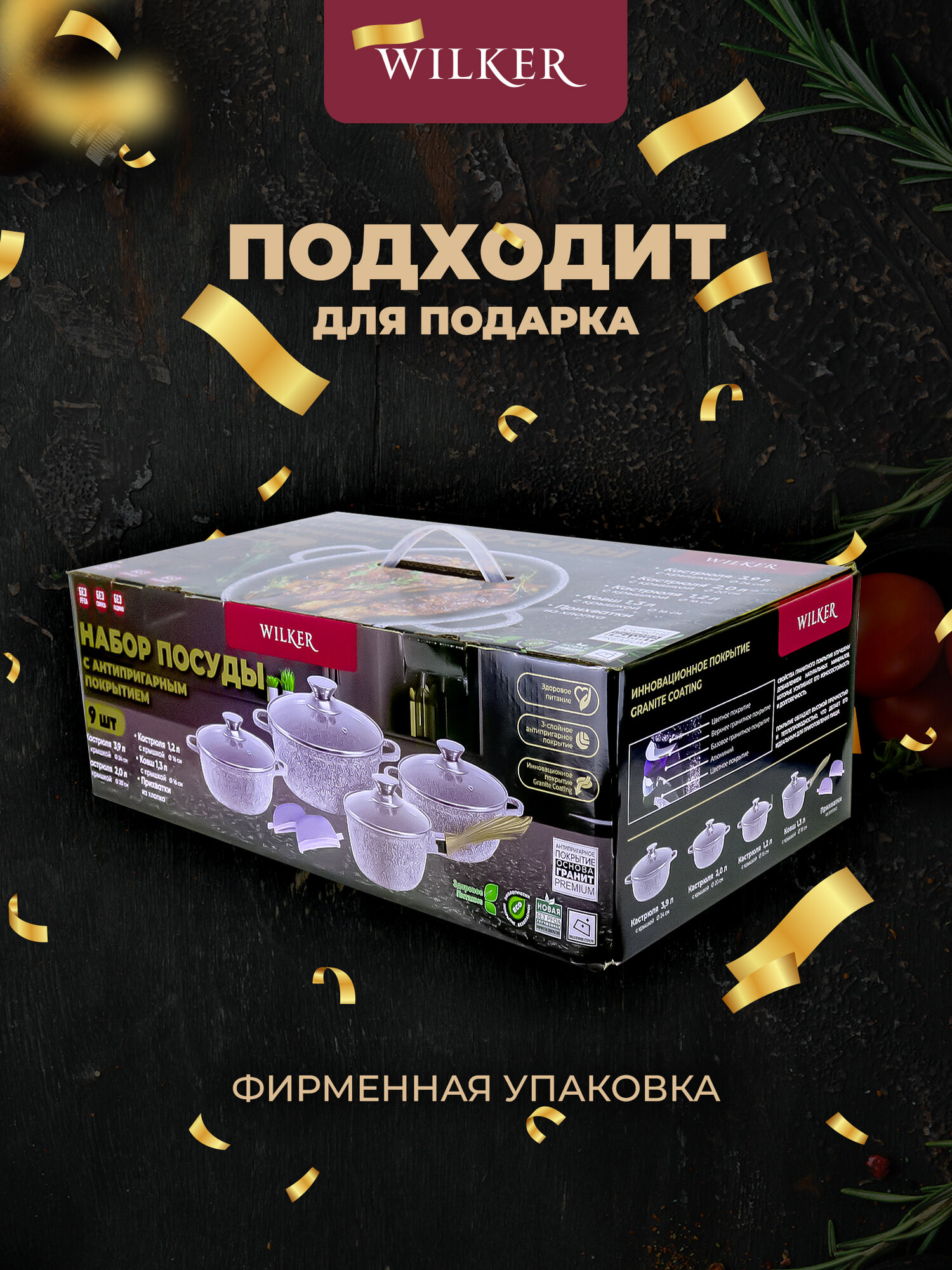 Wilker Набор посуды 4шт кастрюли и ковш 1.2л, 2л, 3.9л, 1.3л, крышки, прихватки (9 предметов)