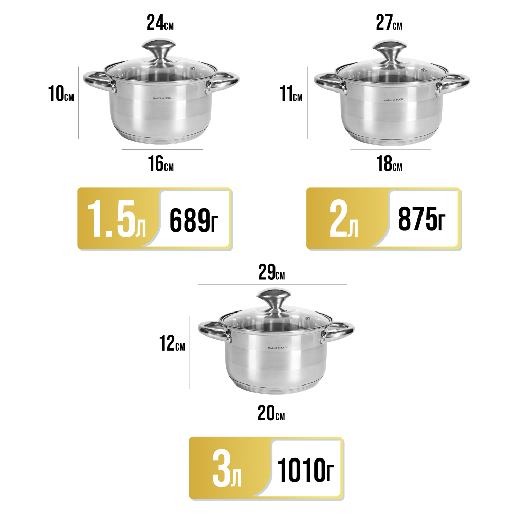 | Комплектация | Кастрюля с крышкой большая: объем 4 л, диаметр корпуса 20 см, диаметр дна 16 см, длина с ручками 30 см, высота борта 12 см, высота с крышкой 16,5 см, вес 1,105 кг. Кастрюля с крышкой средняя: объем 3 л, диаметр корпуса 18 см, диаметр дна 14,5 см, длина с ручками 28,5 см, высота борта 11 см, высота с крышкой 15,5 см, вес 915 г. Кастрюля с крышкой малая: объем 2 л, диаметр корпуса 16 см, диаметр дна 12,5 см, длина с ручками 25,5 см, высота борта 10 см, высота с крышкой 14,5 см, вес 711 г. |
