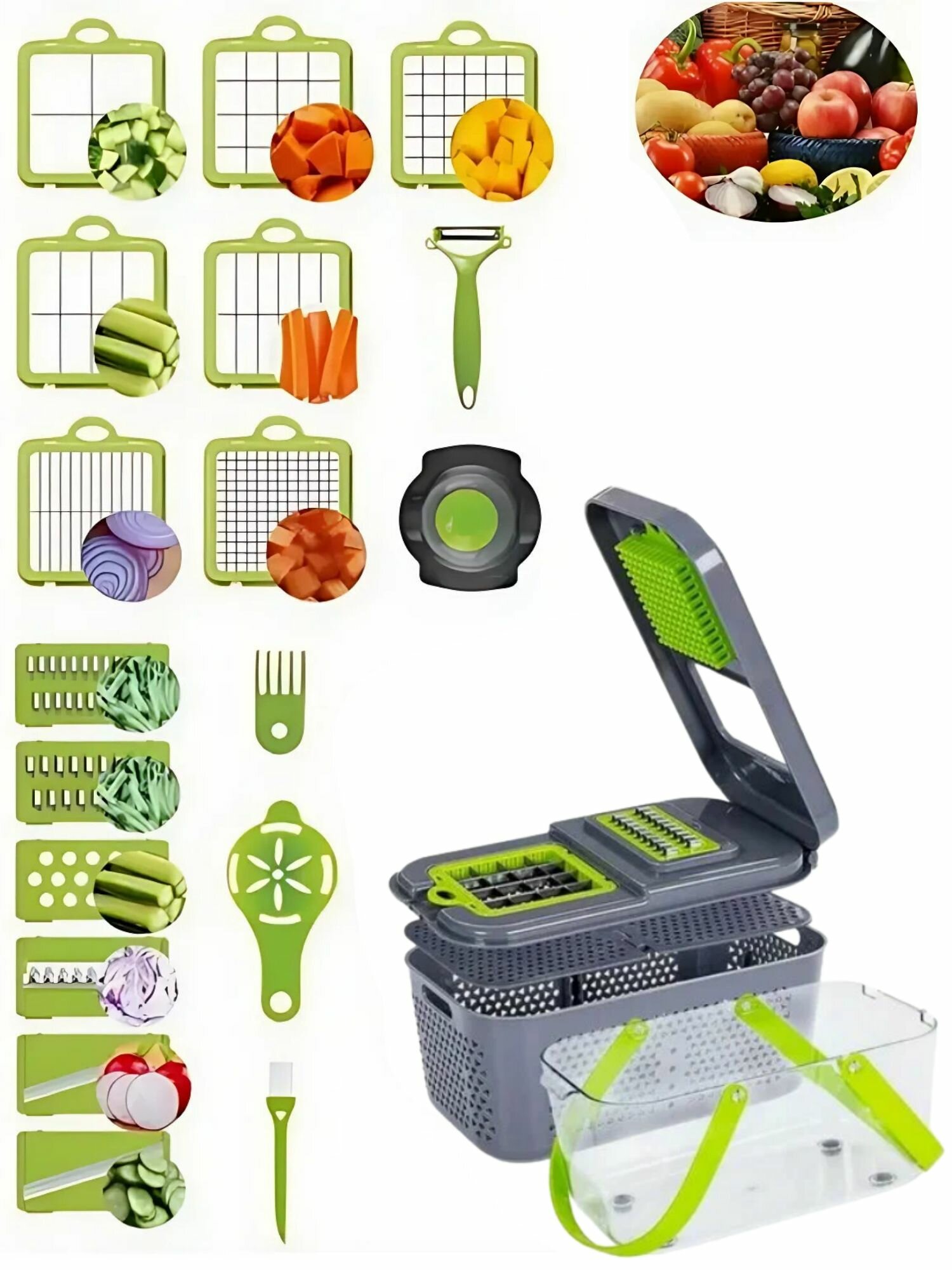 | Комплектация | Овощерезка 1шт насадки 13шт контейнер 1шт нож для чистки овощей 1шт безопасный держатель для продуктов при нарезке |