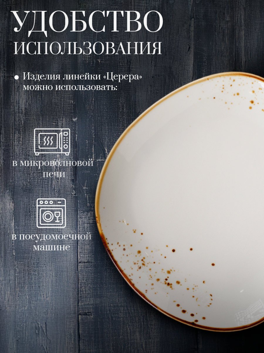 | Дополнительная информация | Окрашивание посуды производится вручную. Яркость цвета зависит от количества нанесённой краски, поэтому может отличаться по оттенку и интенсивности цвета. У товара серии «Церера» допускаются мелкие вкрапления и непрокрасы, так как посуда ручной работы. |