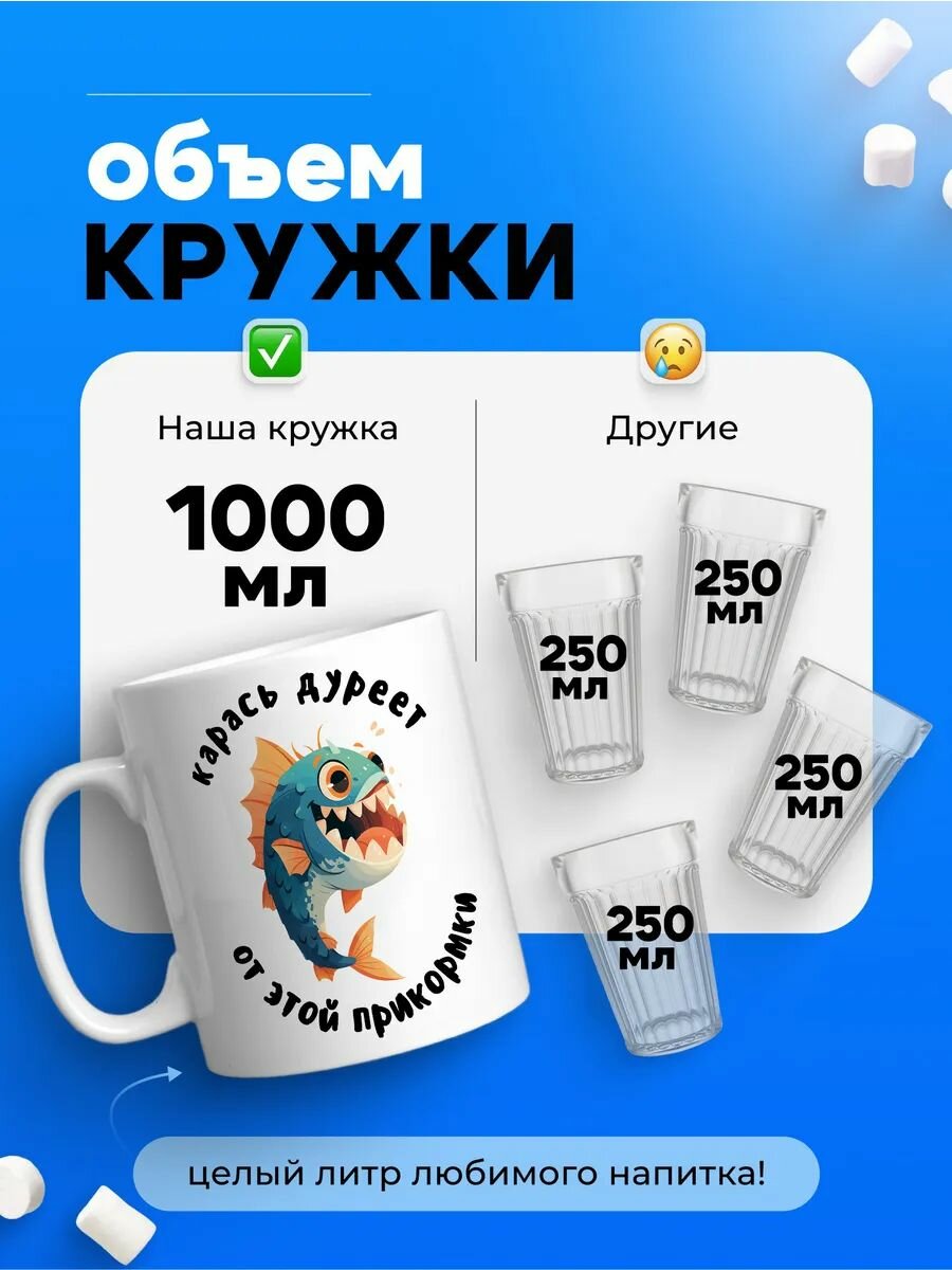 Купить Большая кружка 1 литр для чая и кофе в подарок с принтом "Карась дуреет от этой прикормки"