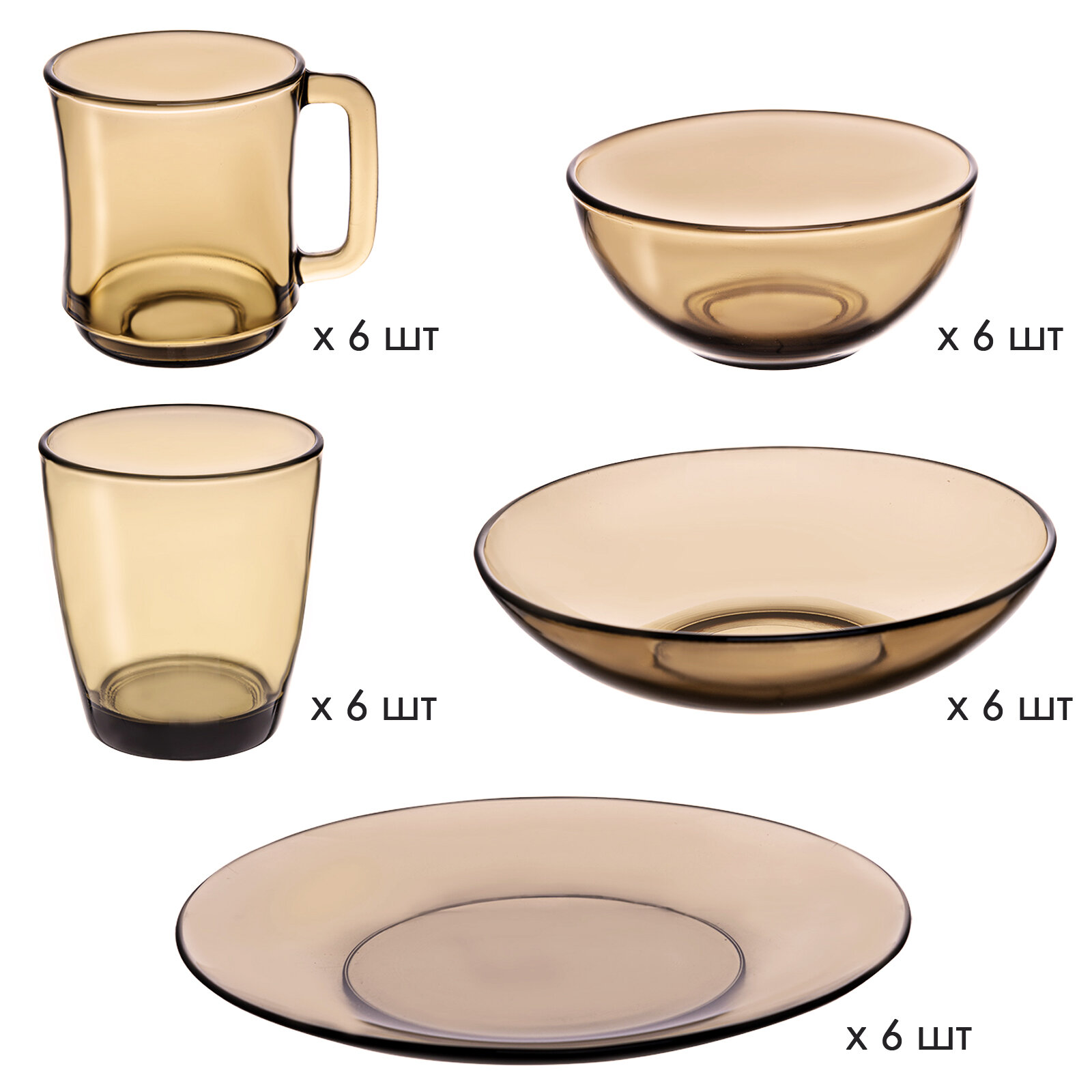 | Состав набора | бокал, кружка, салатник, супница, тарелка обеденная, тарелка суповая |