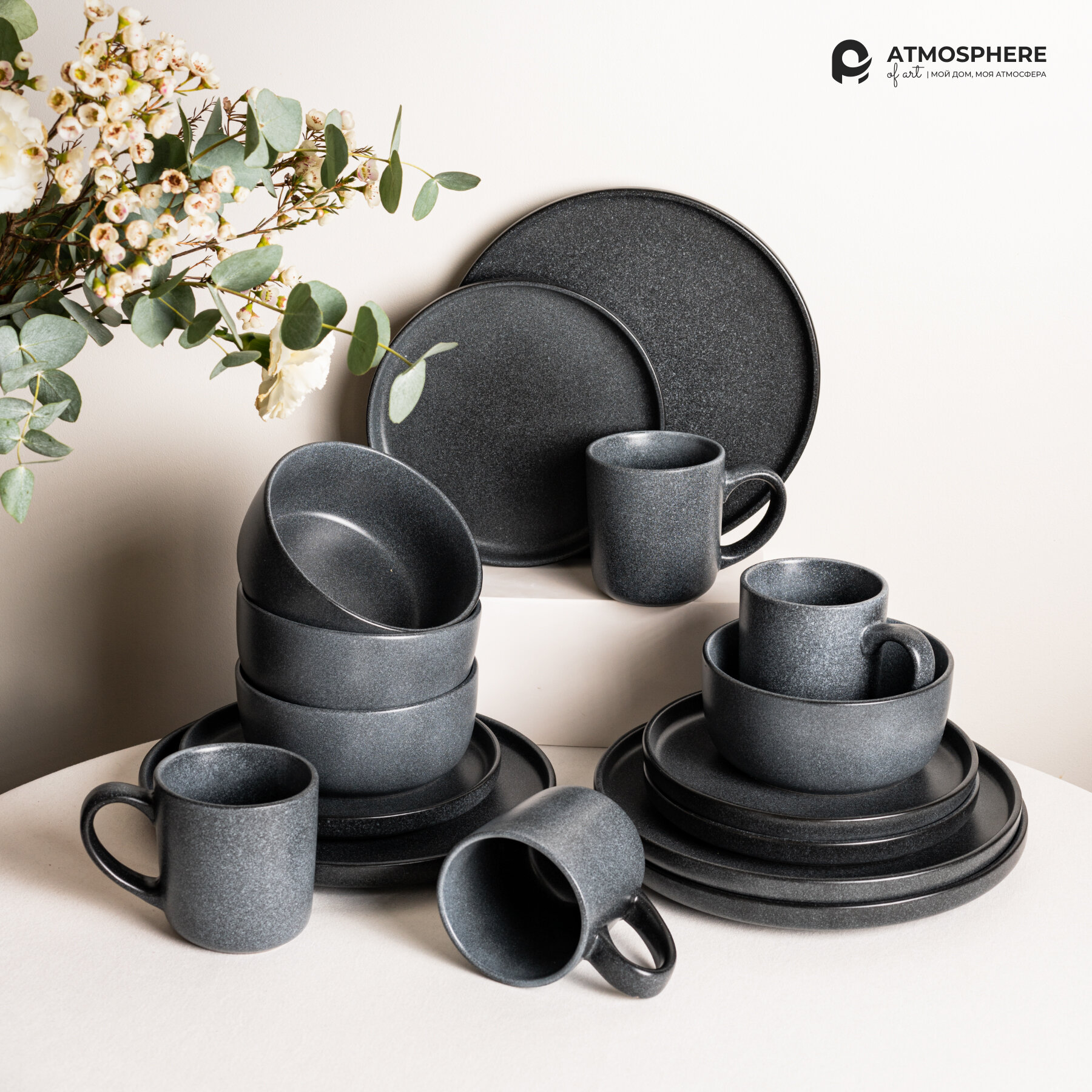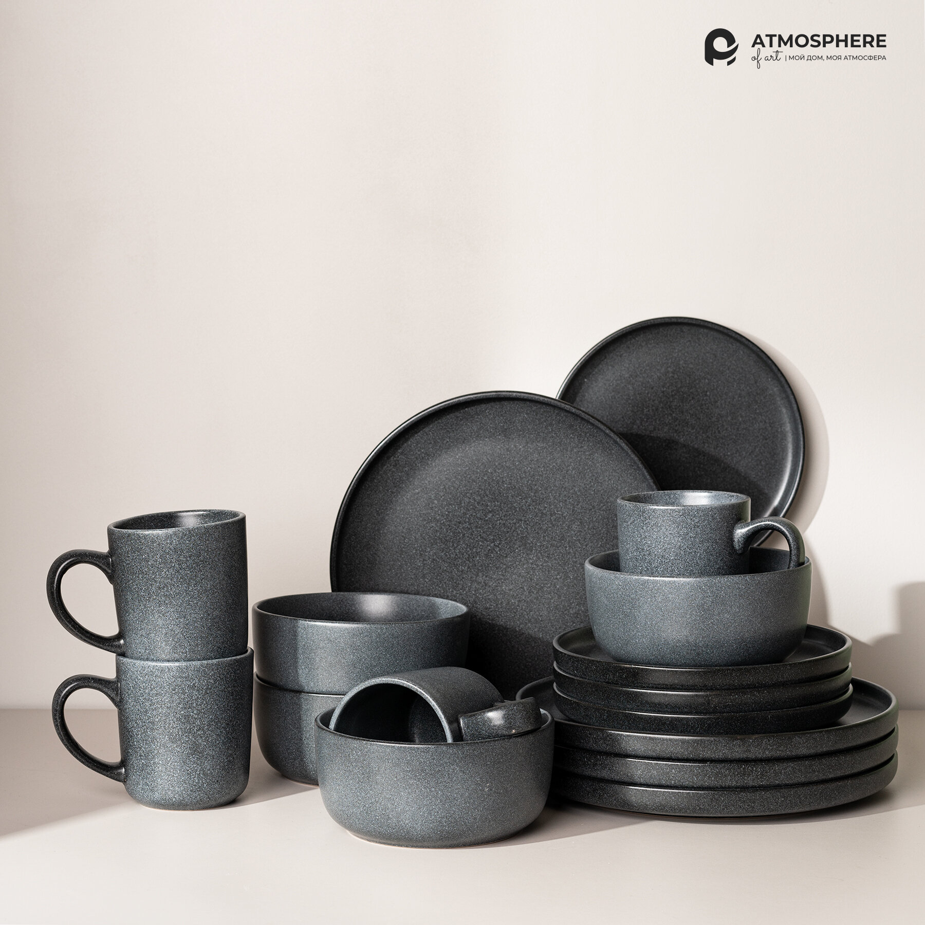 Купить Набор посуды с кружками Atmosphere of Art "Stone" /керамический/ 16 предметов/ черный матовый