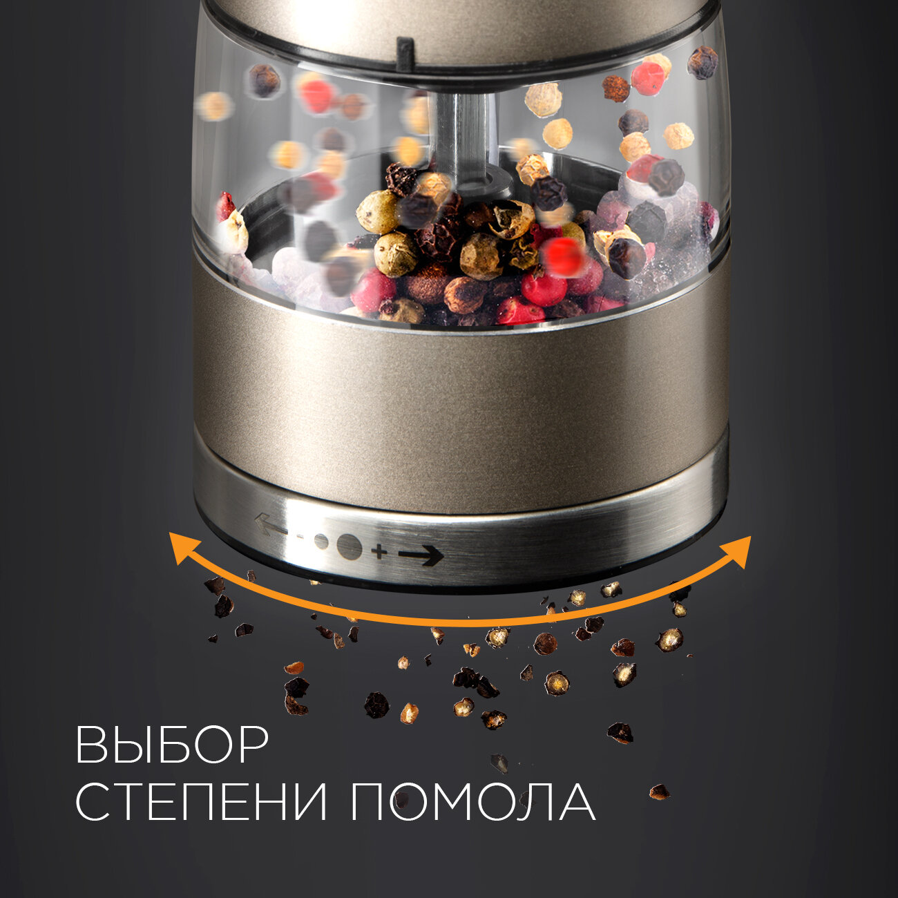 Мельница для специй электрическая REDMOND RKA-PM26, стальная, для соли, перца и специй, керамические жернова, подсветка
