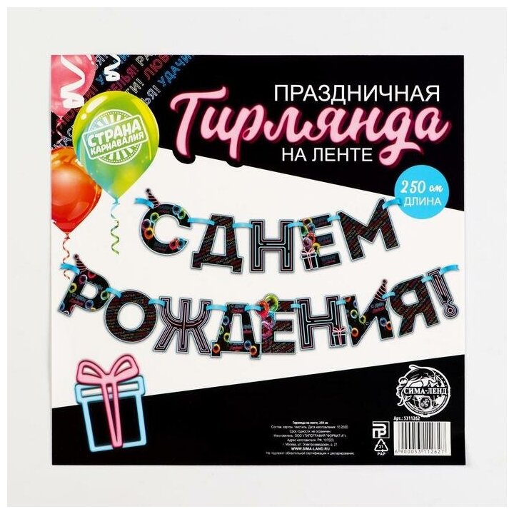 | Комплектация | Гирлянда на ленте "С Днём Рождения!", упаковка |