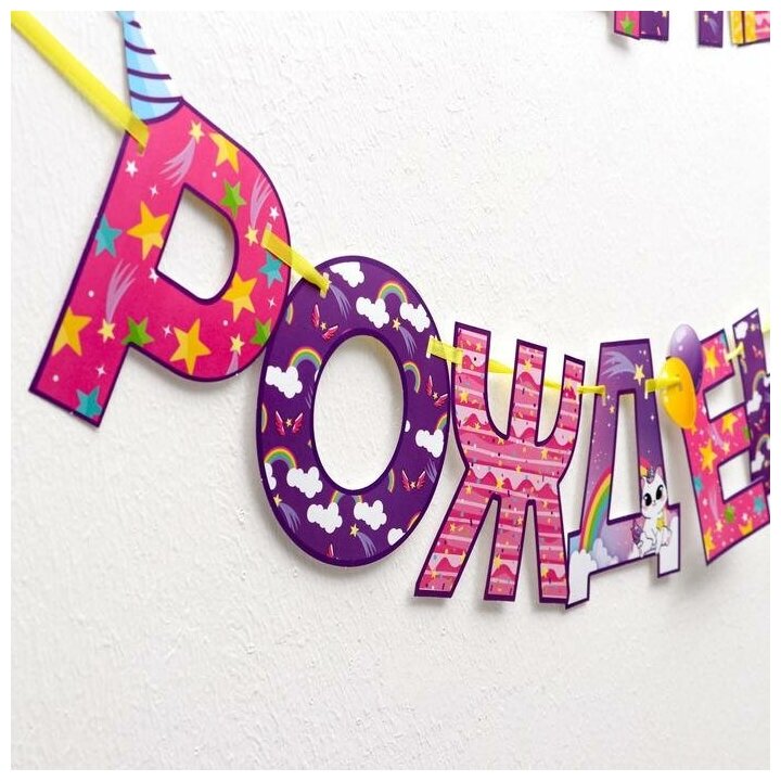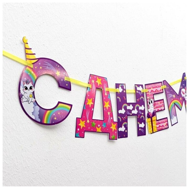 Купить Гирлянда на ленте "С Днем Рождения!", радужный котик, длина: 250 см, для девочек