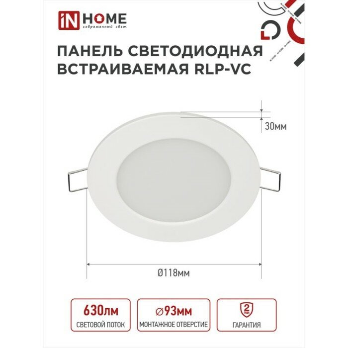 | Дополнительная информация | Светильник встраиваемый In Home RLP-VC 9Вт 230В 4000К 630Лм IP40 118мм белый |