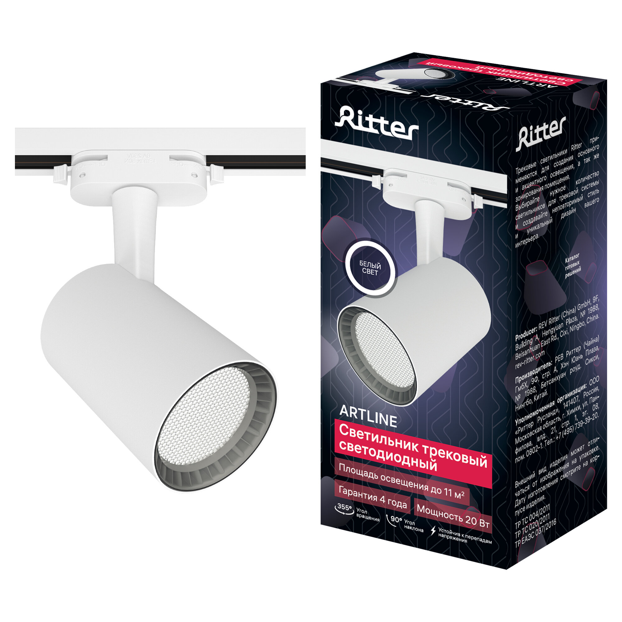Купить Трековый светильник Ritter Artline, поворотный, антибликовый, цилиндр, 83х120х170mm, 20Вт, 1700Лм, 4000К, 230В, алюминий, белый, 59