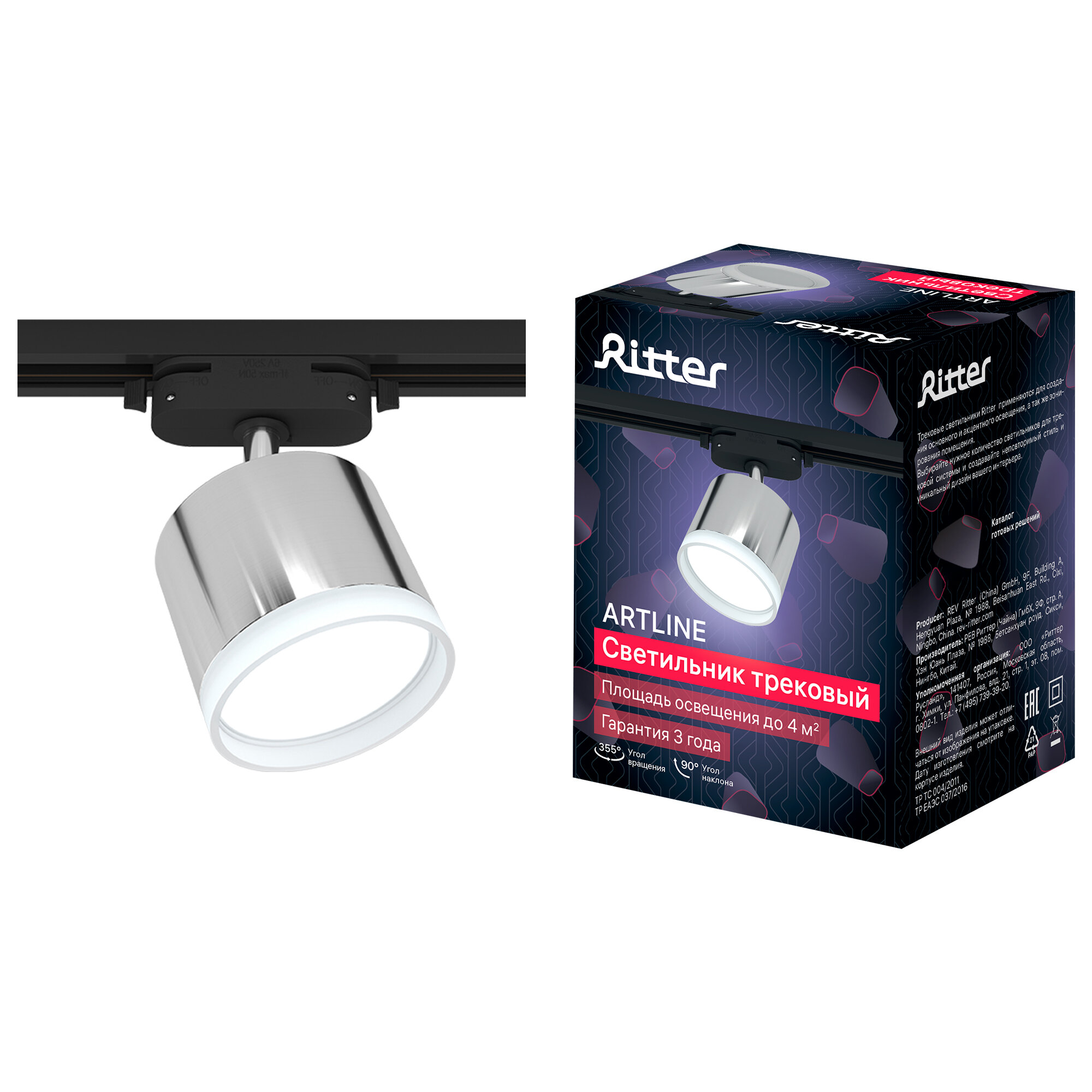 Светильник трековый потолочный поворотный однофазный хром под лампу GU10, до 40Вт, крепление на любой шинопровод 220В, Ritter ARTLINE 59877 4