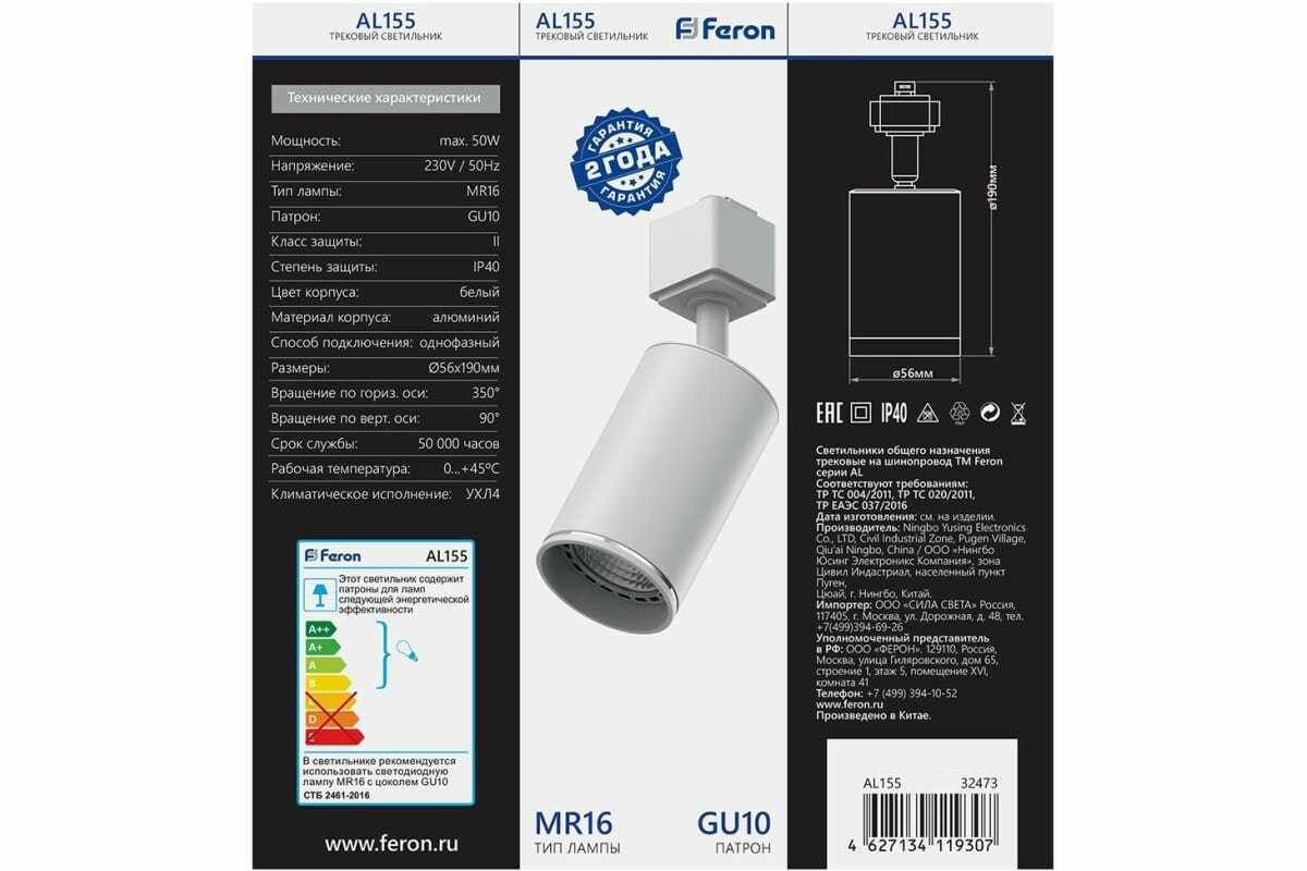 Купить Светильник Feron AL155 трековый однофазный на шинопровод под лампу GU10, белый
