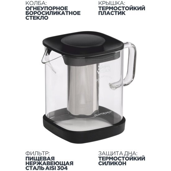 | Комплектация | Чайник заварочный 4в1 VITAX Thirlwall 900мл термостекло, пластик, нерж. сталь, силикон |
