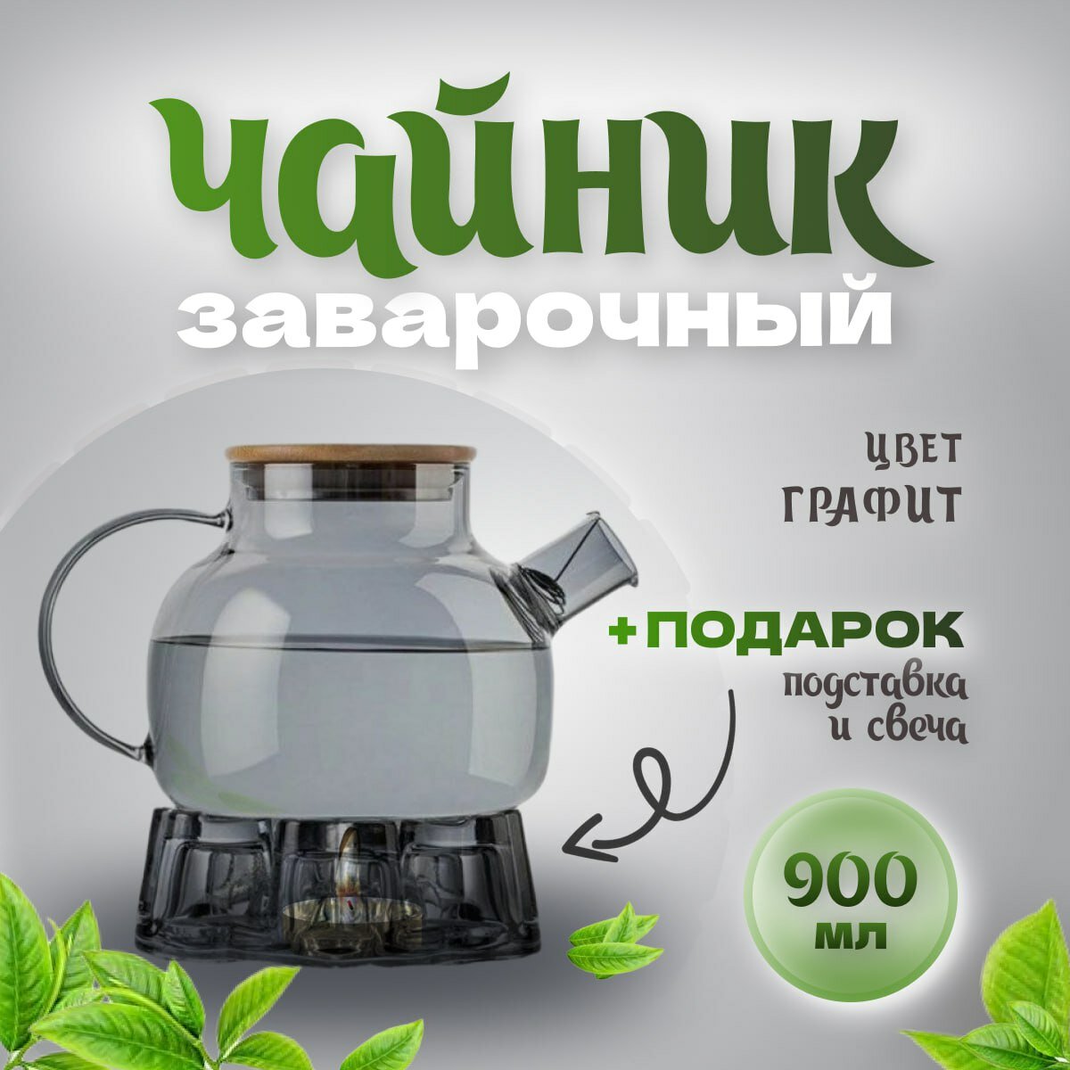 Чайник заварочный стеклянный 900 мл, с фильтром и подставкой для подогрева от свечи, 2 свечи в подарок интересное:
