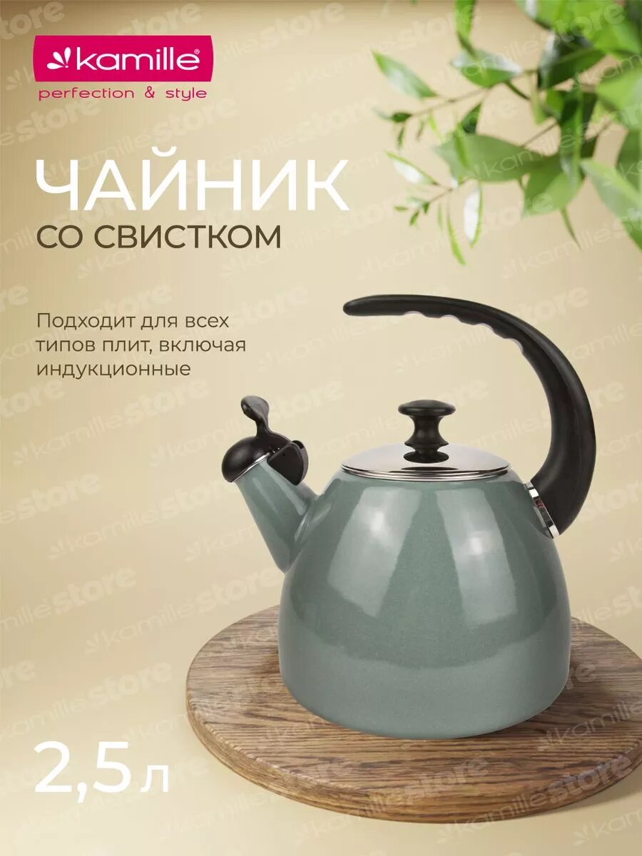 Чайник 2,5 л. эмалированный со свистком Kamille KM 1040A с черной бакелитовой ручкой (2,5 л. / оливковый)