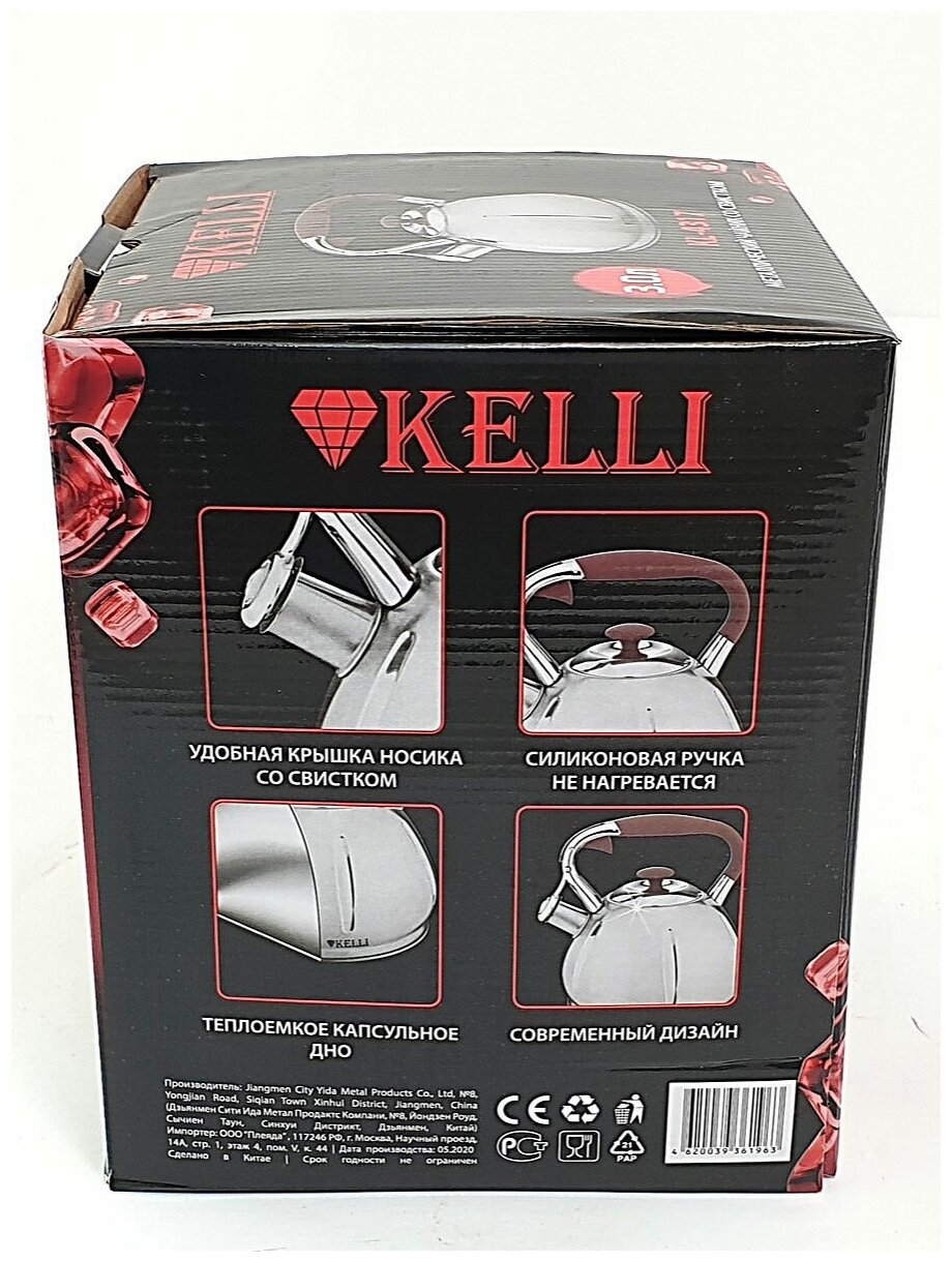 | Комплектация | Чайник Kelli подойдет для использования на конфорках газовых, керамических и электрических моделей кухонных плит, поэтому Вы можете не беспокоиться о сохранности дорогой бытовой техники. Корпус рассматриваемой модели изготовлен из износостойкой нержавеющая стальавеющей стали, придающей ей презентабельный внешний вид |