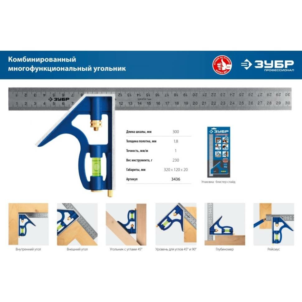 Комбинированный многофункциональный угольник ЗУБР 300 мм 3436_z02 интересное: