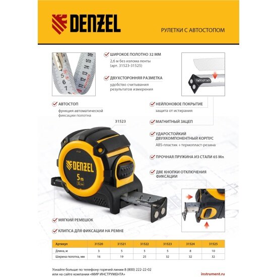 Рулетка Denzel 5м х 32ммавтоматич. фиксац., нейлон. покрытие, магнит. зацеп, двухстор. разметка 31523