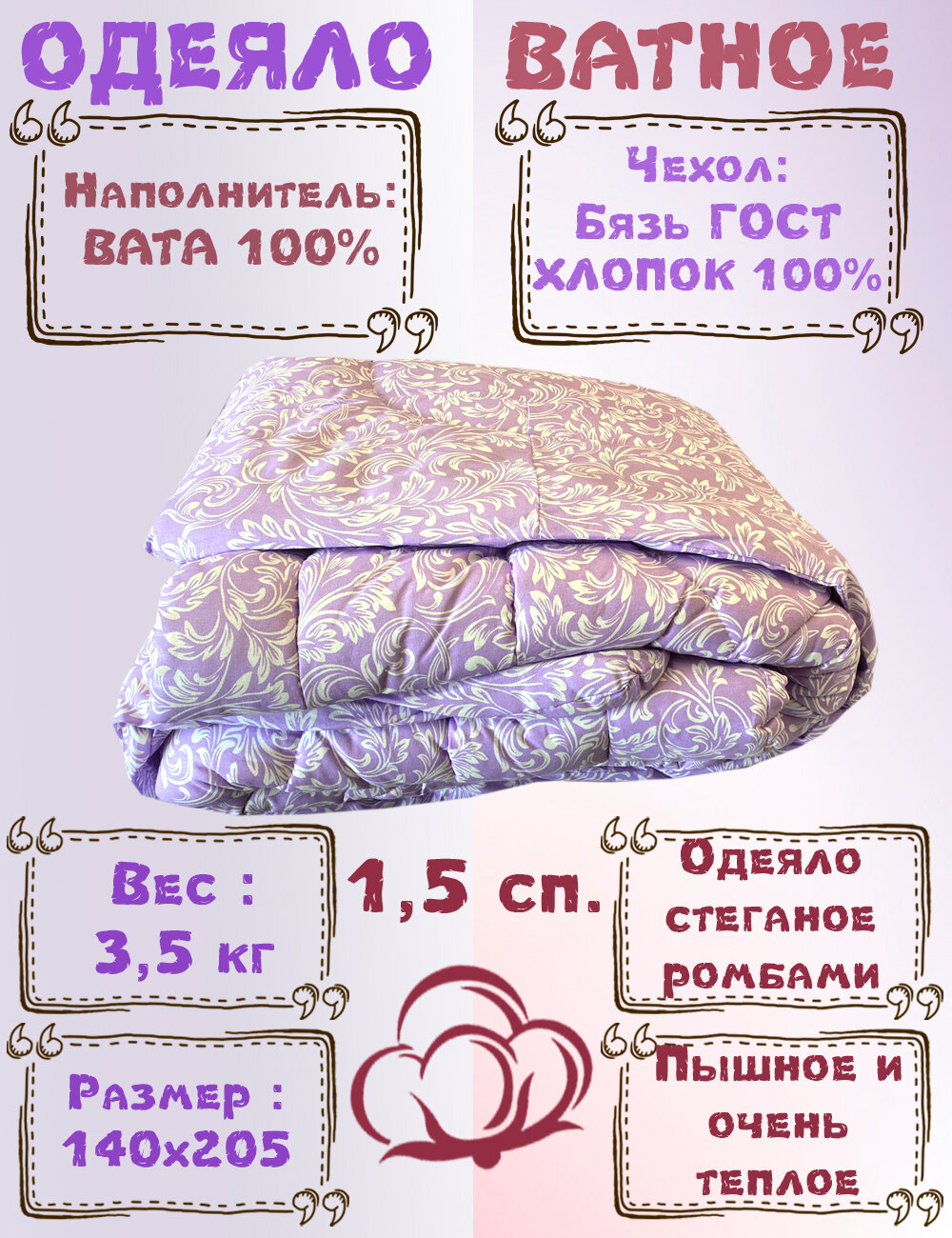 Одеяло 1.5 сп ватное 140х205 Вата 100%