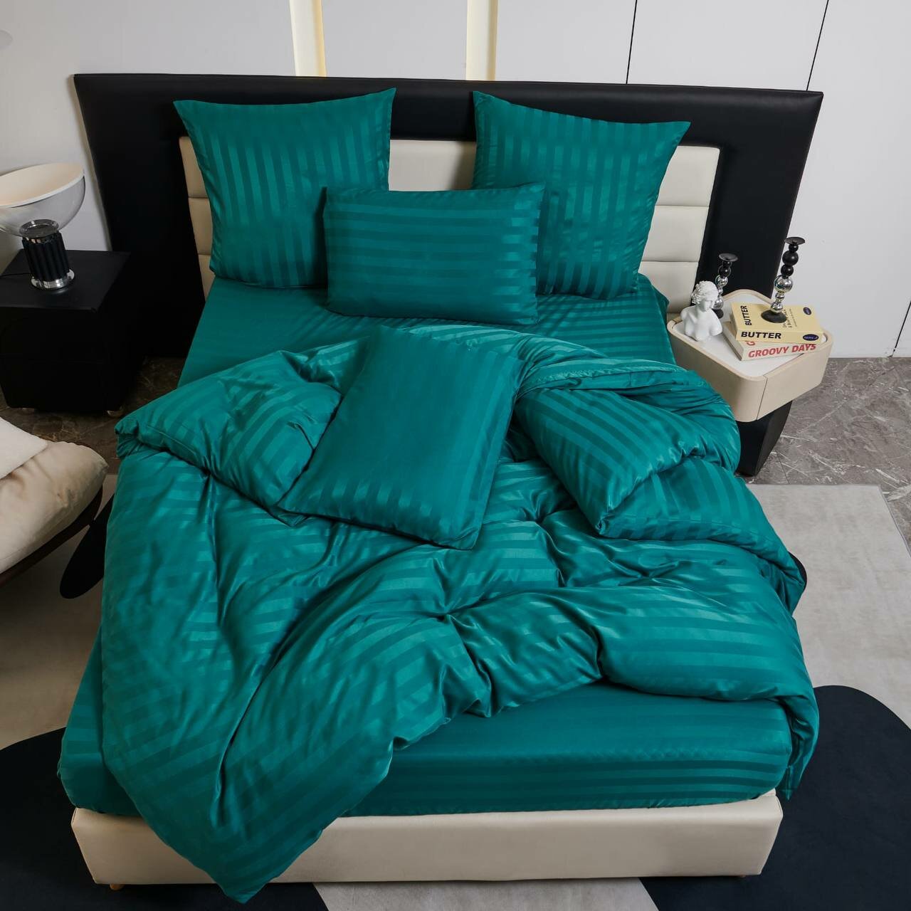 Постельное белье евро двуспальное зеленый BorisMency страйп сатин простынь на резинке 180x200+25, пододеяльник 200x220, наволочки 50x70-2, 70x70-2