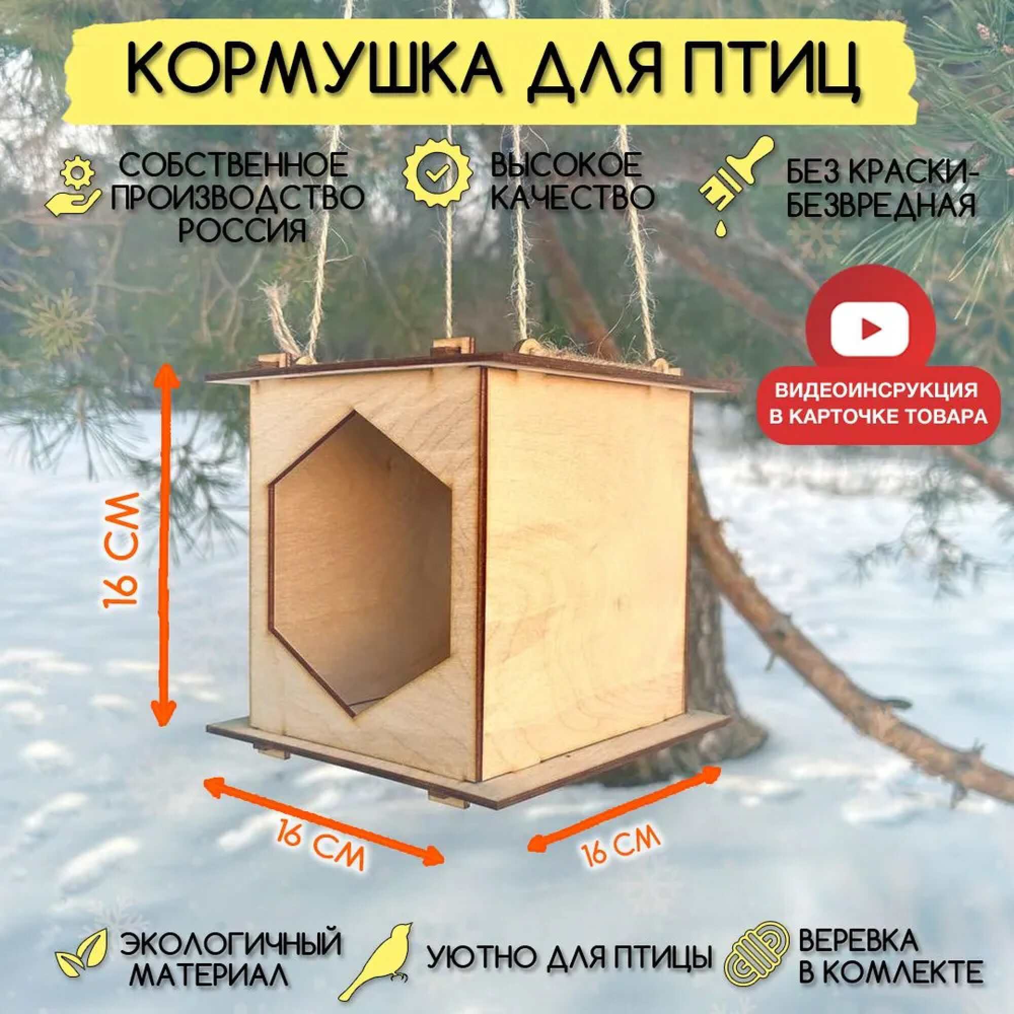 | Дополнительная информация | Деревянная прямоугольная закрытая сборная подвесная кормушка весной и летом для корма на дерево с крышей для мелких птиц и грызунов. Верёвка в комплекте. |