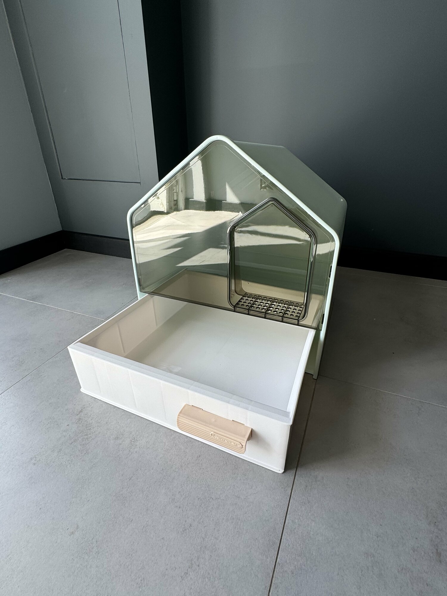 Закрытый лоток-домик с выдвижным поддоном и совком «Чистый котик» 41,5х45,5х45 см, серый
