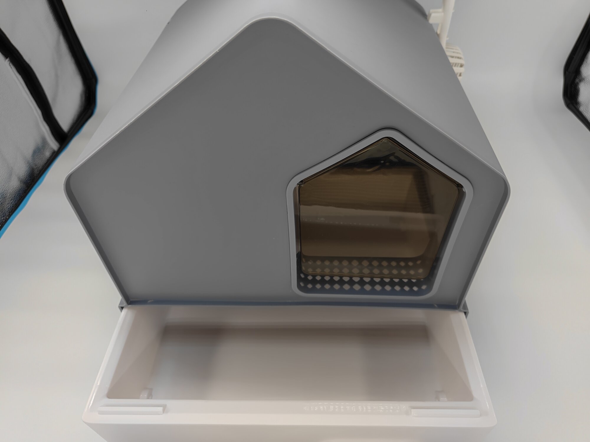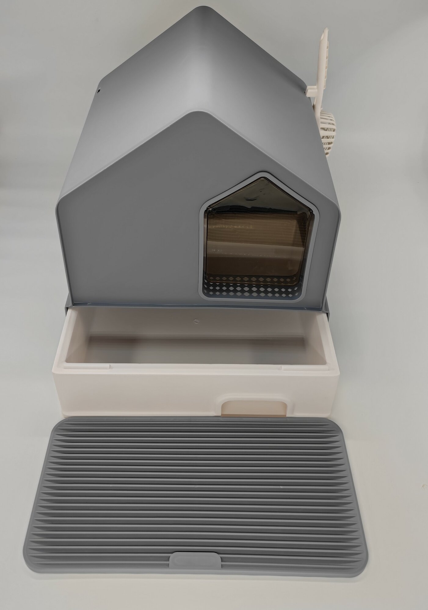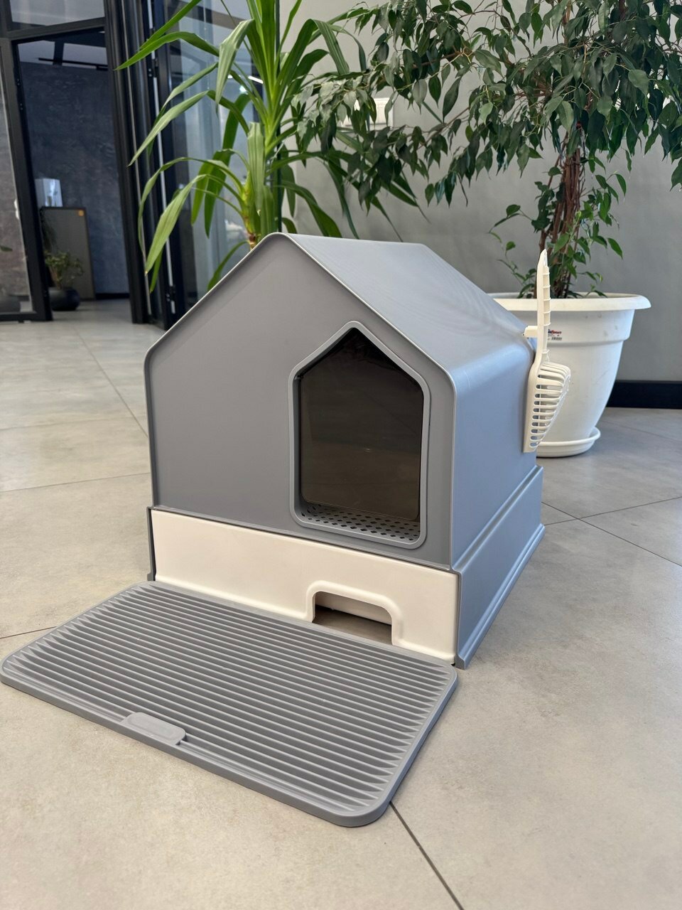 Закрытый лоток-домик с выдвижным поддоном и совком «Чистый котик» 41,5х45,5х45 см, серый