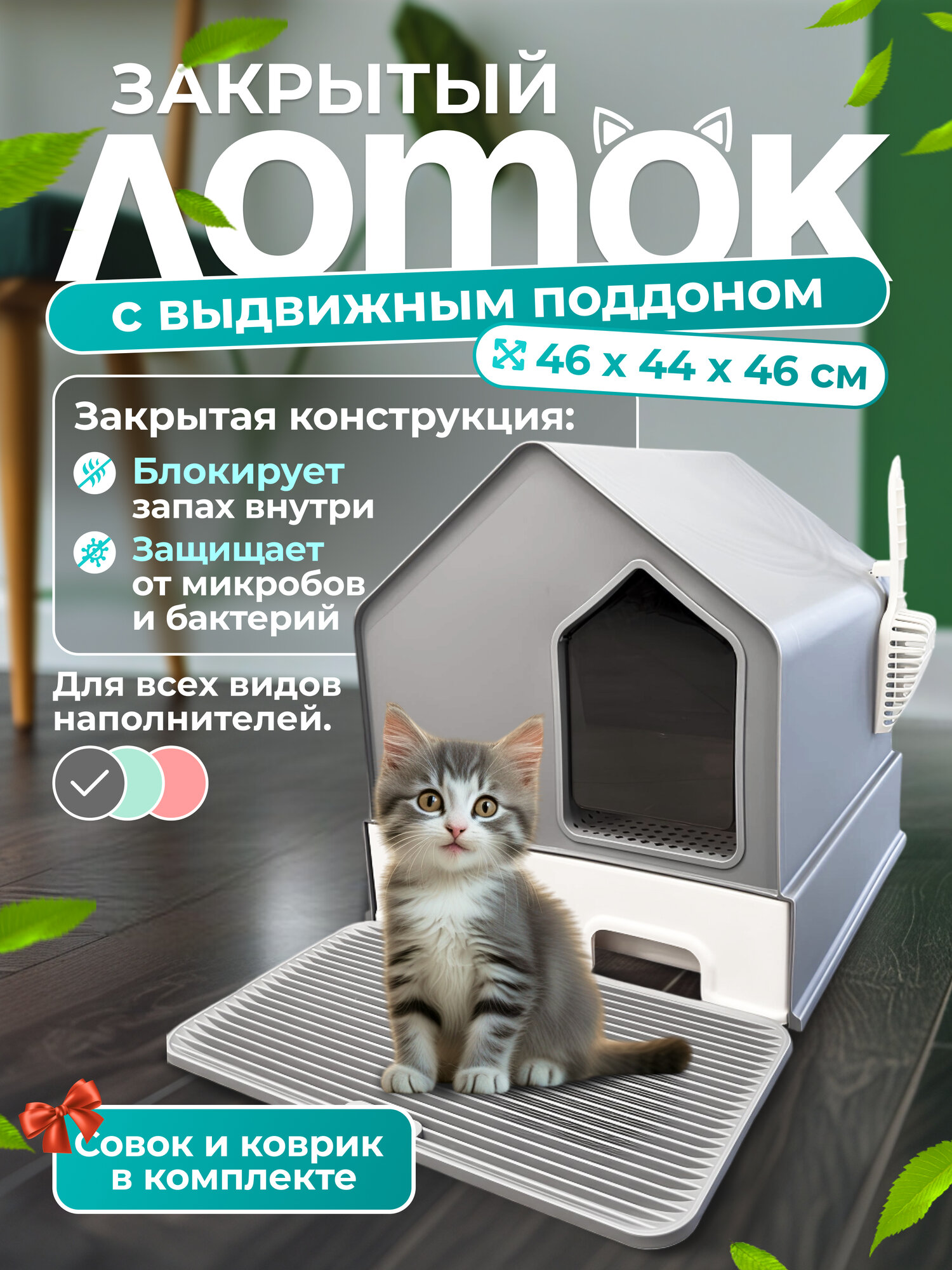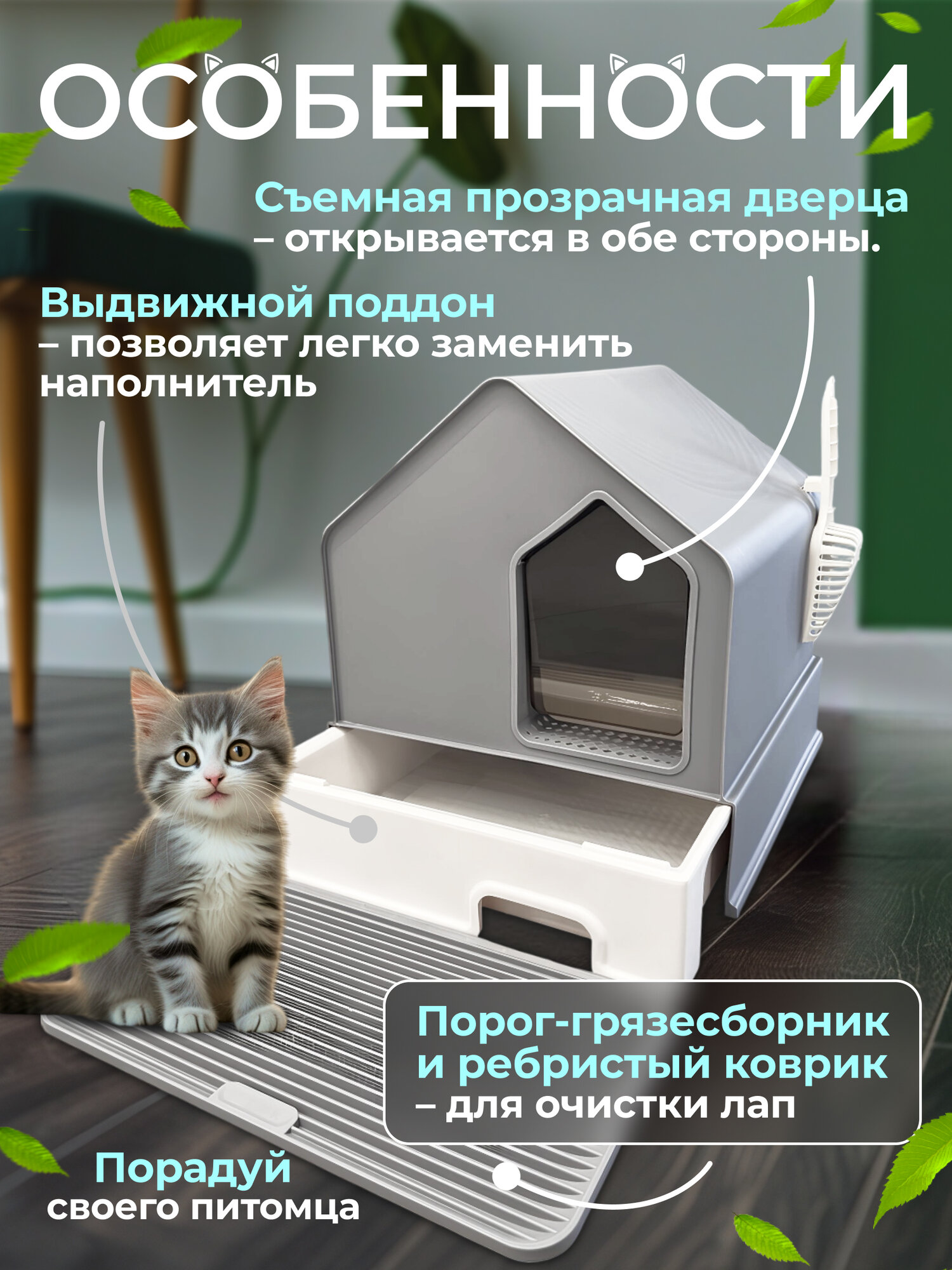 СохранитьЗакрытый лоток-домик с выдвижным поддоном , совком «Чистый котик» " 46х44х46 см, серый интересное: