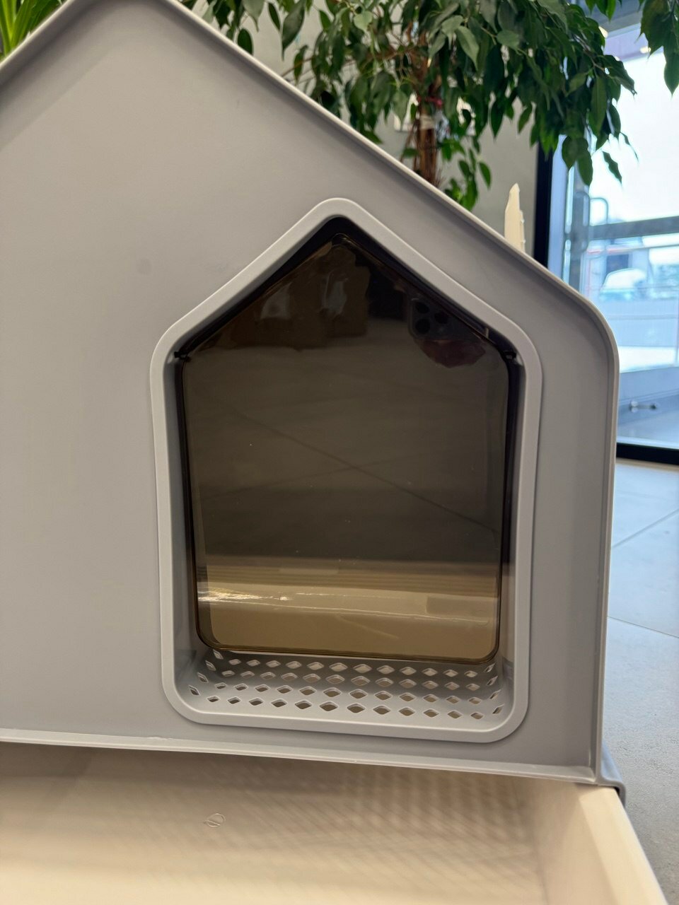 Закрытый лоток-домик с выдвижным поддоном ,совком и украшением крыши «Чистый котик» " 48х46х51 см., серый