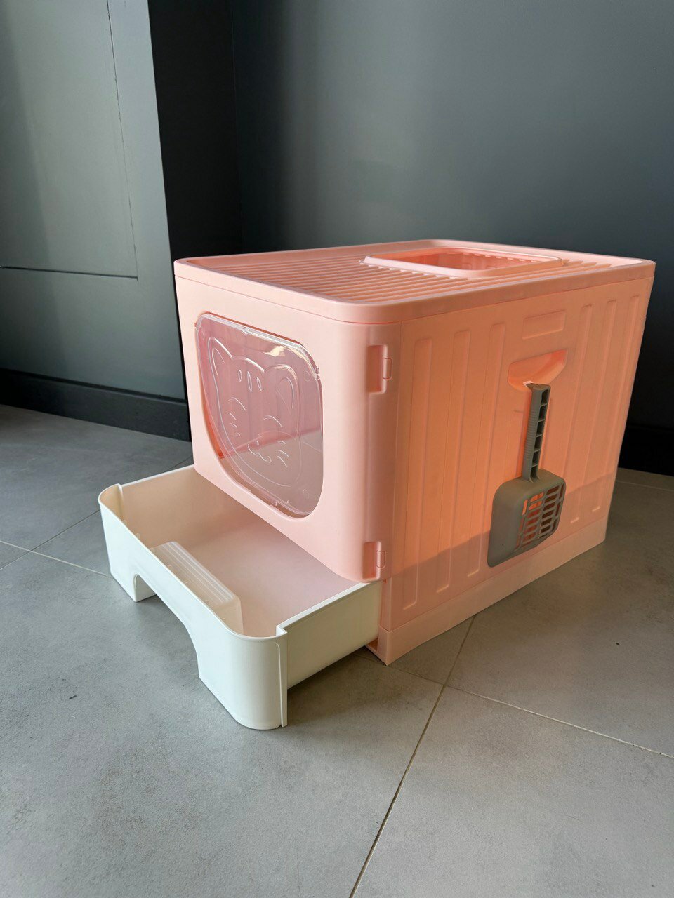 Закрытый лоток-домик с выдвижным поддоном , совком «Чистый котик» " 46х44х46 см, розовый