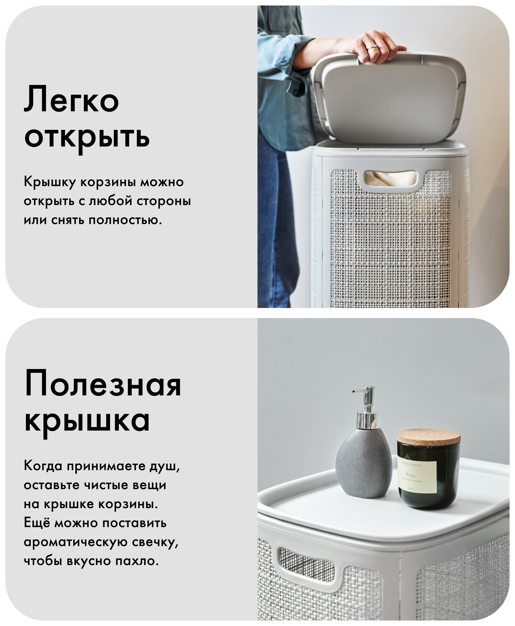 | Особенности | плетеная / ручки для переноски / с крышкой / складной / узкая |