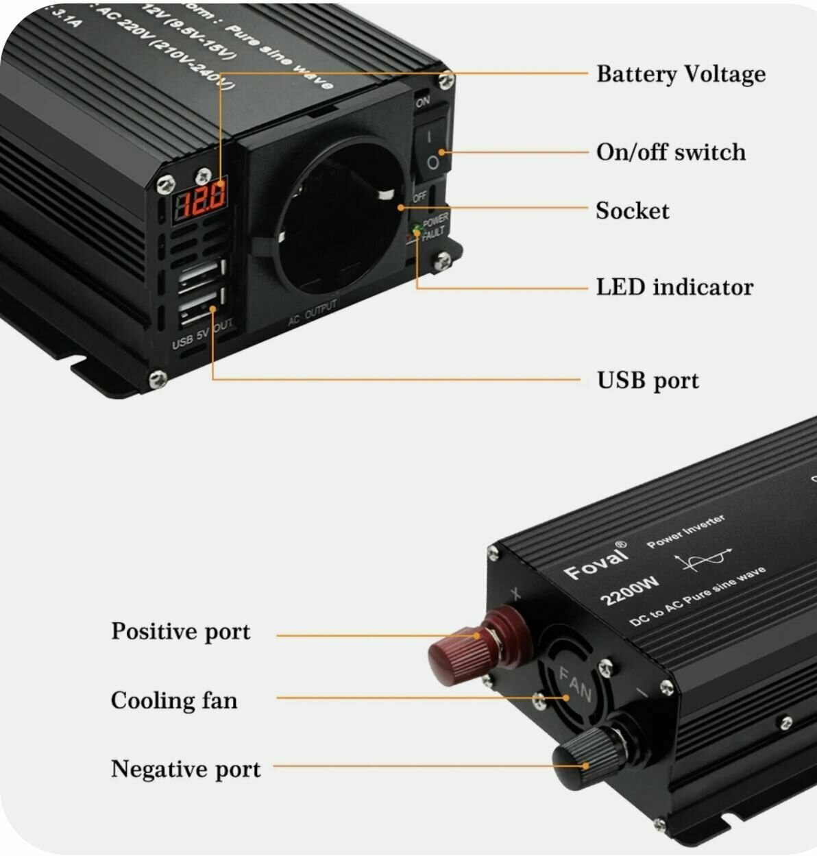Автомобильный преобразователь напряжения инвертор 2000-2200 Вт 12В-220В Foval 2000w-2200 12v-220v Power inverter Чистая, немодифицированная синусоида.