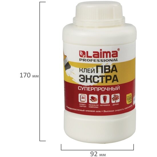 Клей ПВА Экстра Суперпрочный 1 кг (керамика, ткань, кожа, дерево, бумага, картон), LAIMA, 606432, 606432