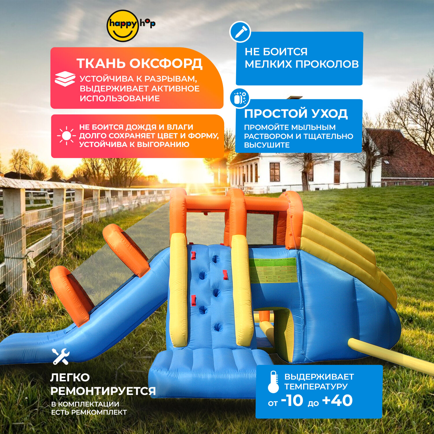 Детский надувной батут Happy Hop "Мега аттракцион", с горкой, с защитной сеткой, 735х630х250 см интересное:
