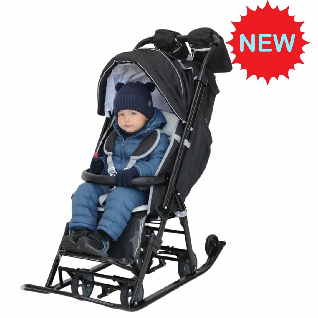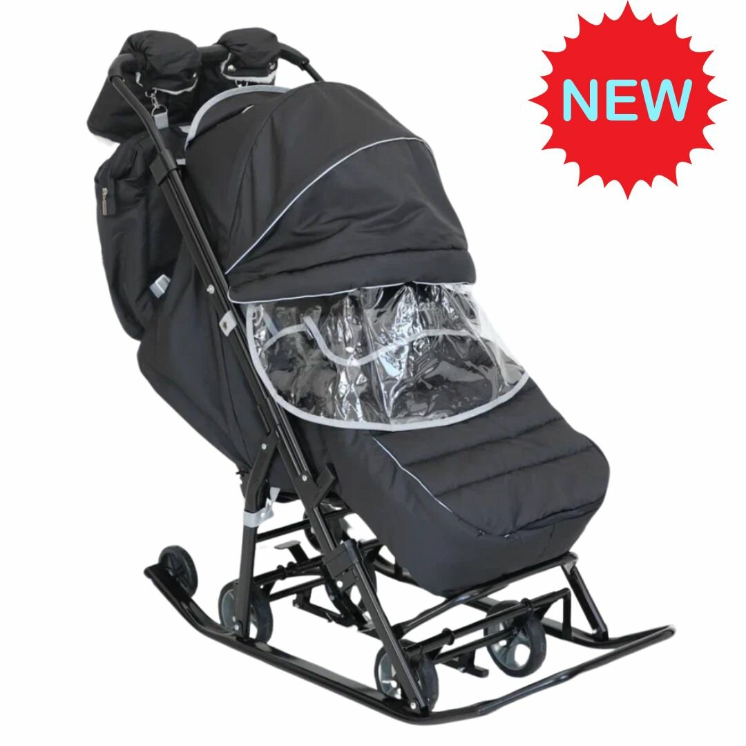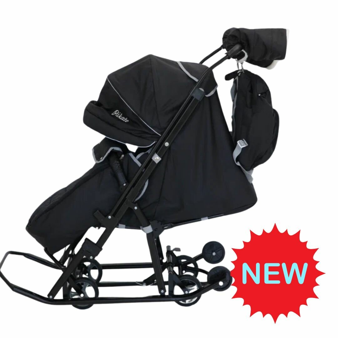Санки-коляска с бампером , детские, зимние на колесах Pikate "Black ONYX" цвет: черный.