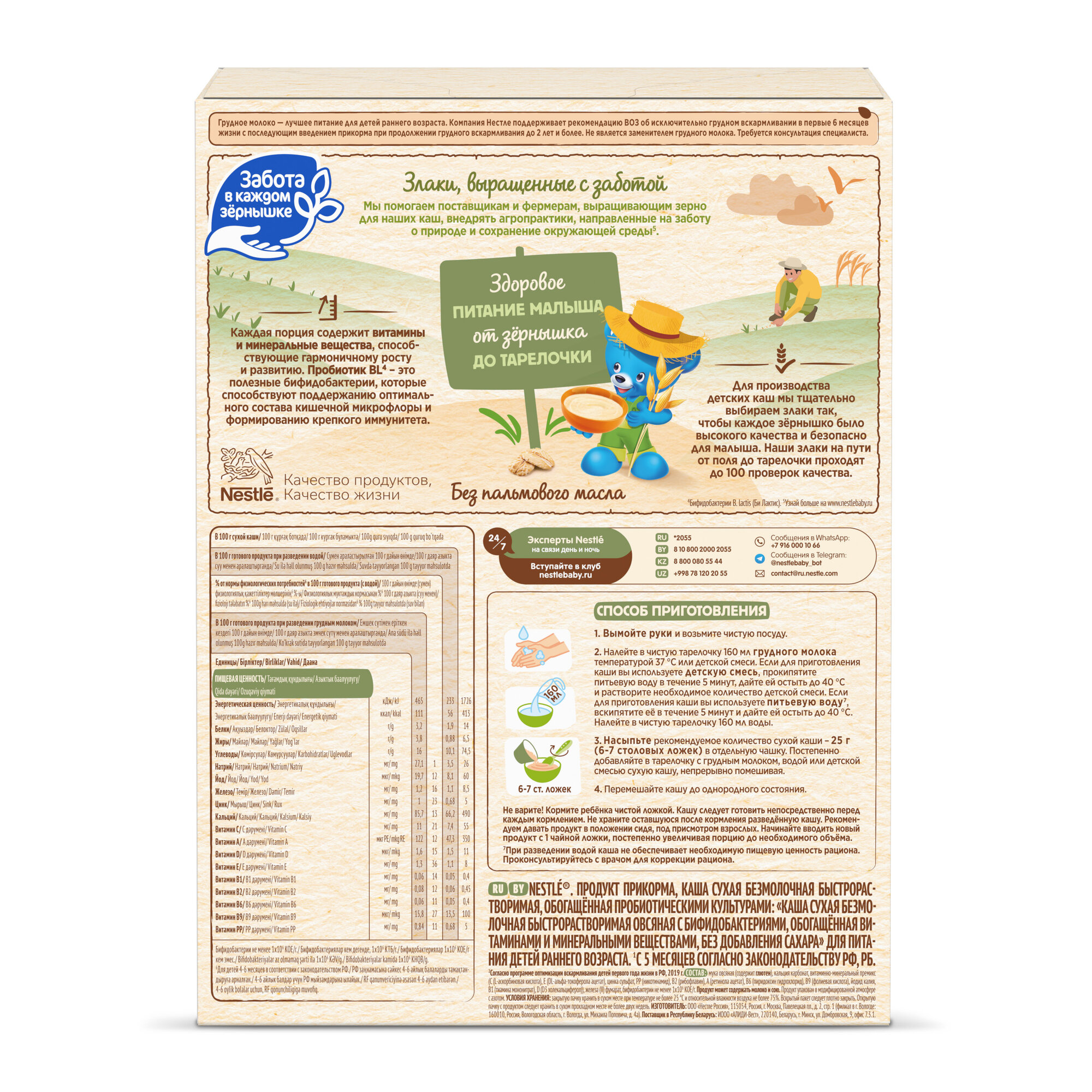 | Состав | мука овсяная (содержит глютен), кальция карбонат, витаминно-минеральный премикс (С (L-аскорбиновая кислота), E (DL-альфа-токоферола ацетат), цинка сульфат, РР (никотинамид), В2 (рибофлавин), A (ретинола ацетат), В6 (пиридоксин гидрохлорид), B9 (фолиевая кислота), йодид калия, В1 (тиамина мононитрат), D (D3 холекальциферол)), соль, железа (II) фумарат, бифидобактерии не менее 1х106 КОЕ/г. Продукт может содержать молоко и сою. |