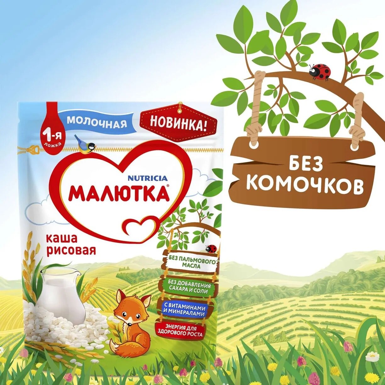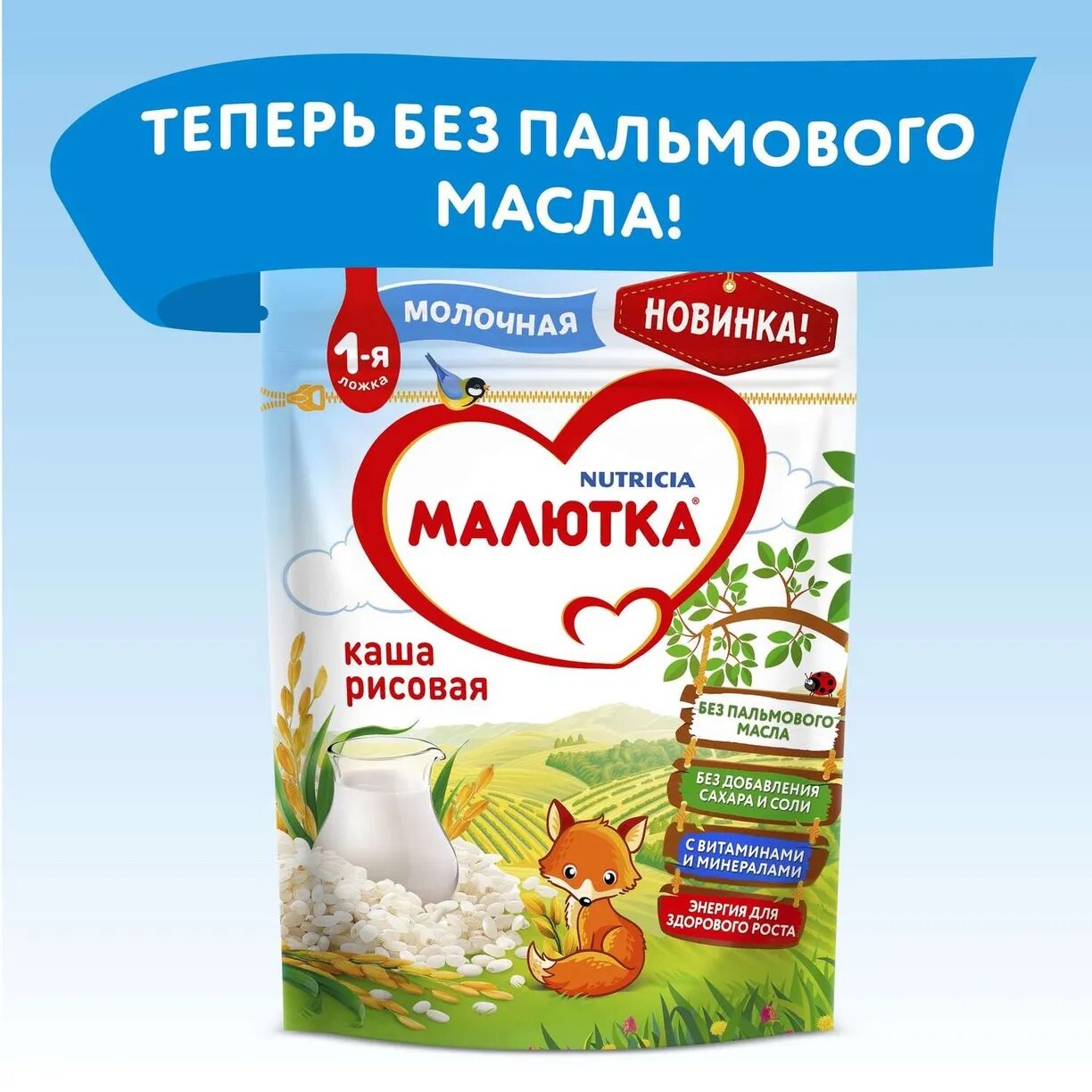 | Состав | мука рисовая, сухая молочная основа (обезжиренное молоко, смесь растительных масел (подсолнечное, рапсовое, высокоолеиновое подсолнечное, кокосовое, эмульгатор - лецитины (из подсолнечника)), сухое обезжиренное молоко, лактоза, регулятор кислотности - гидроксид калия), сухое обезжиренное молоко, мальтодекстрин, витаминно-минеральный премикс (мальтодекстрин, холекальциферол, тиамина мононитрат, фолиевая кислота, железа фумарат, цинка сульфат). Может содержать следы глютена. *Содержит сахара природного (естественного) происхождения |