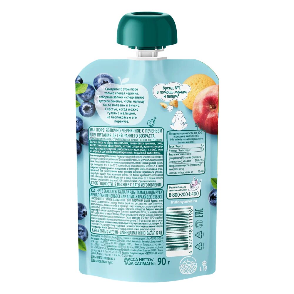 | Состав | Пюре из яблок, пюре из черники, вода питьевая, печенье (мука пшеничная, сахар, масло сливочное, яйцо куриное, экстракт солодовый, молоко сухое цельное, крахмал кукурузный, разрыхлители (карбонаты аммония, карбонаты натрия), натуральный ароматизатор «Печенье». |