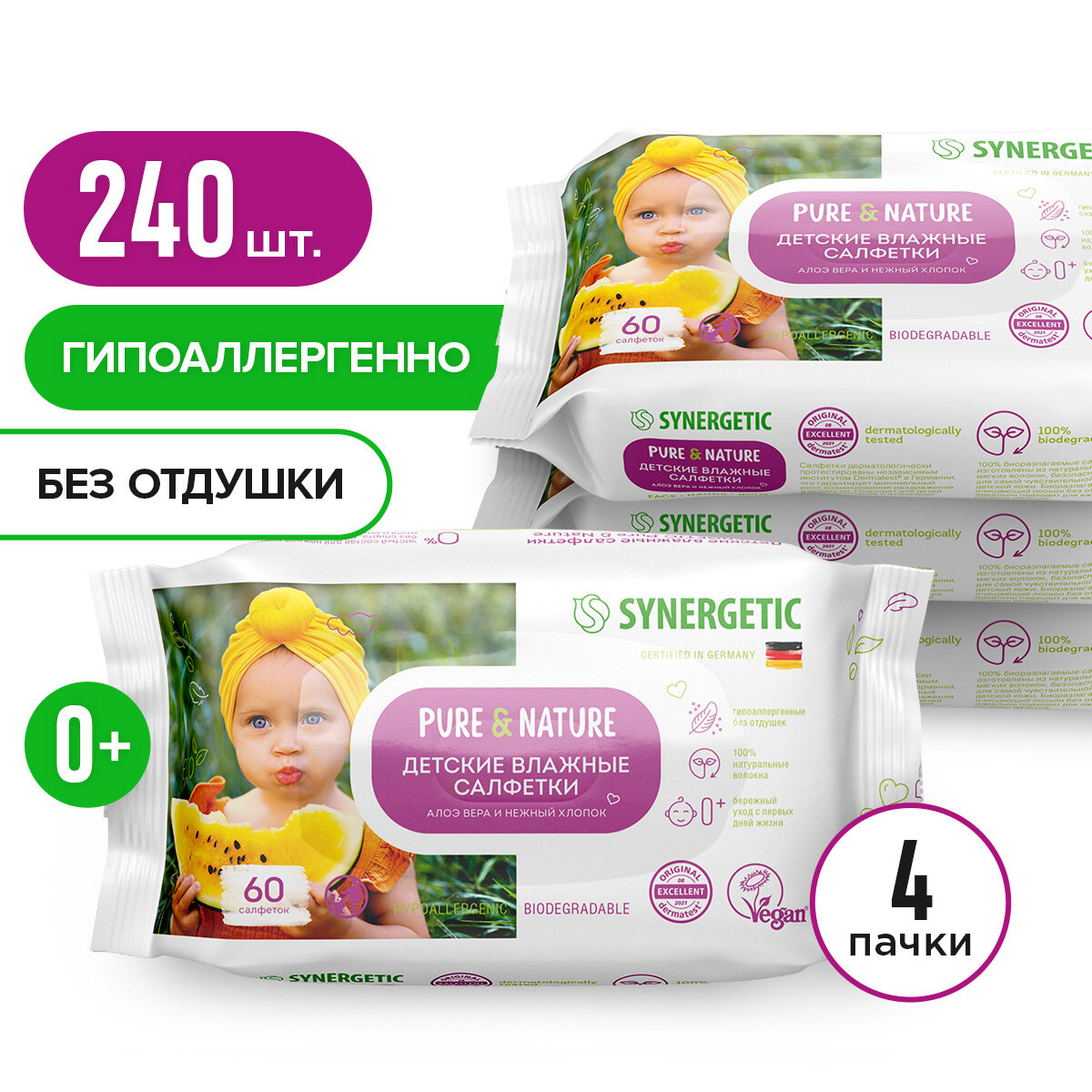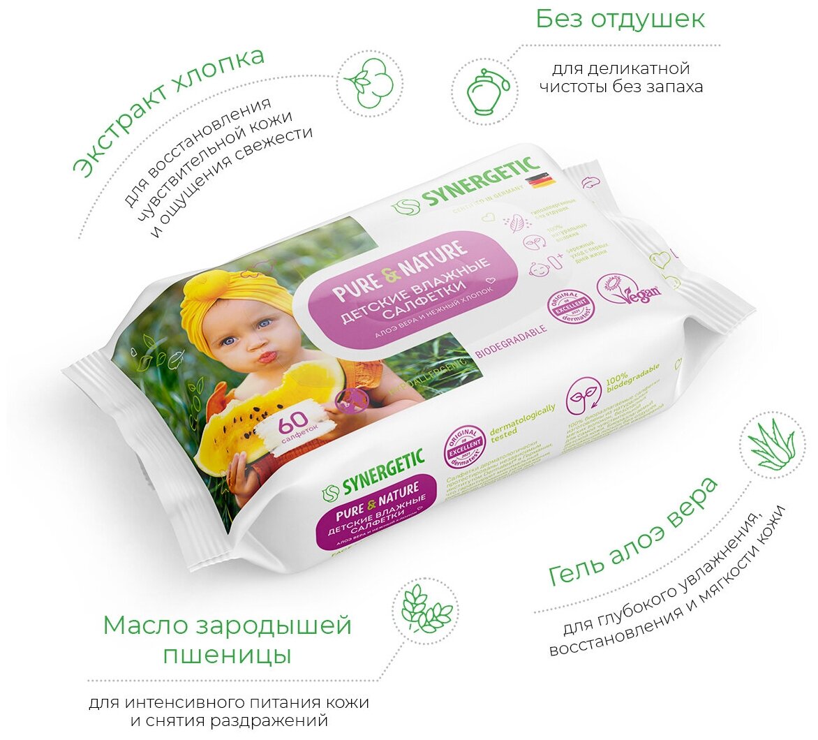 Детские влажные салфетки SYNERGETIC Pure&Nature «Алоэ вера и нежный хлопок» без отдушек, гипоаллергенные, биоразлагаемые, для новорожденных 0+, 60 шт.