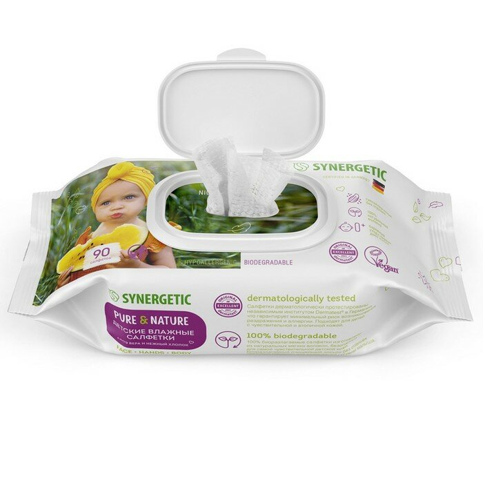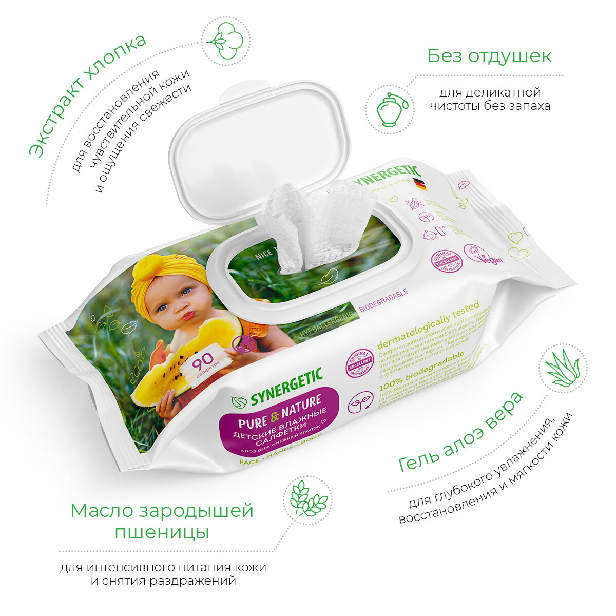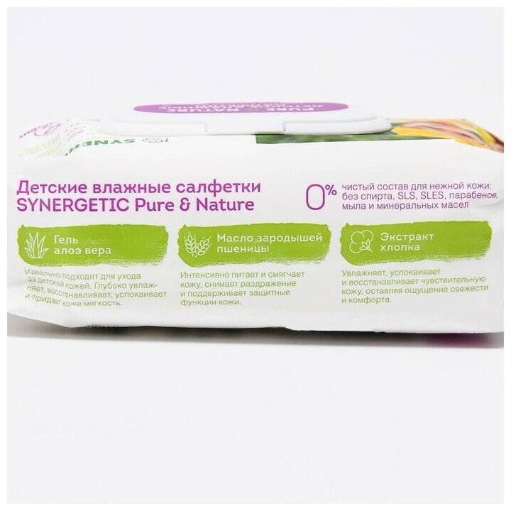 Детские влажные салфетки SYNERGETIC Pure&Nature «Алоэ вера и нежный хлопок» без отдушек, гипоаллергенные, биоразлагаемые, для новорожденных 0+, 60 шт.