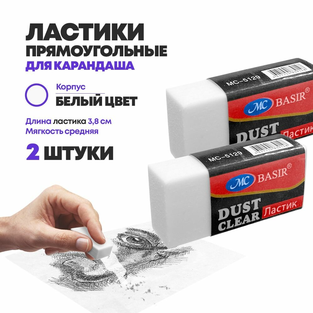 Ластики для карандаша прямоугольные, 2 шт, белый цвет, длина 3.8 см, MC-Basir, для стирания простых и цветных карандашей, каучуковые
