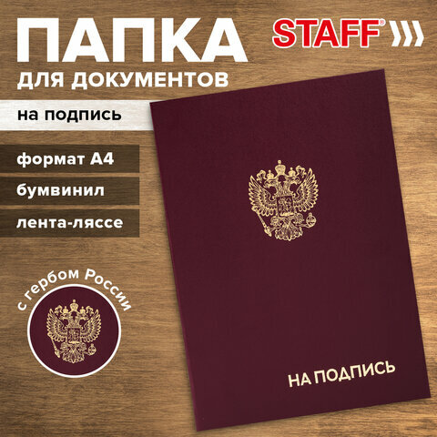 Папка адресная канцелярская для документов На Подпись с гербом России, А4, бордовая, индивидуальная упаковка, Staff Basic, 129626