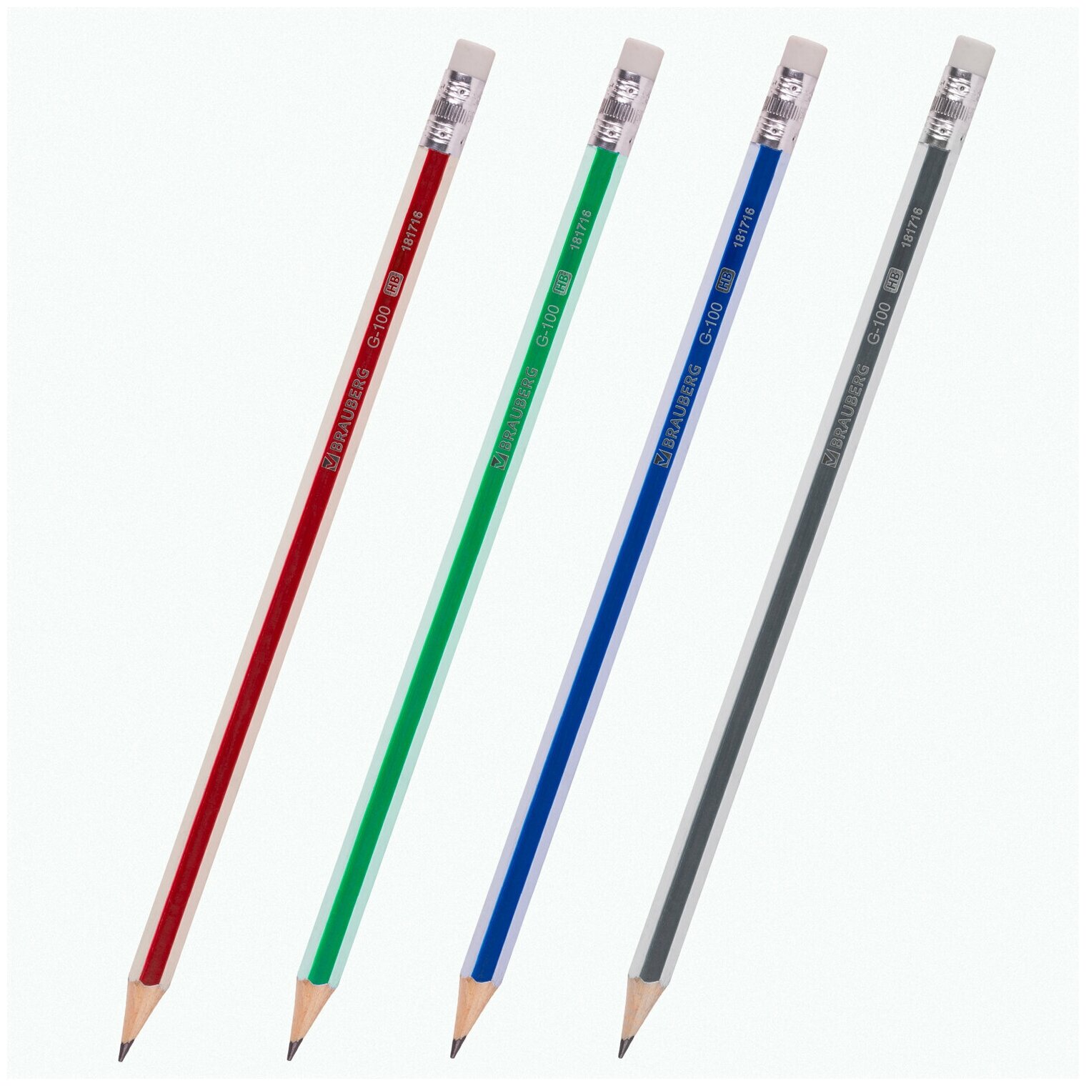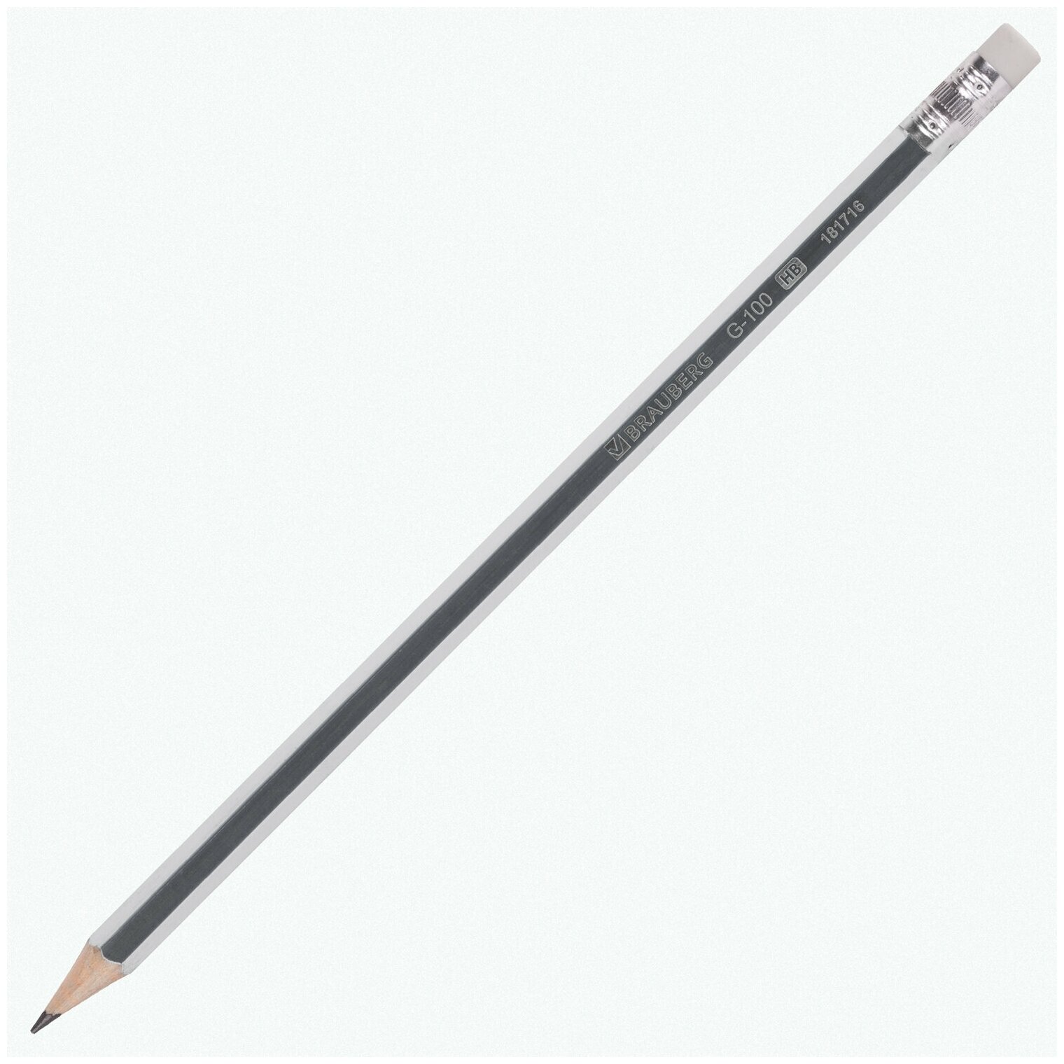 Купить Карандаши простые чернографитные Brauberg G-100 12 шт, HB, с ластиком, корпус ассорти, 181716