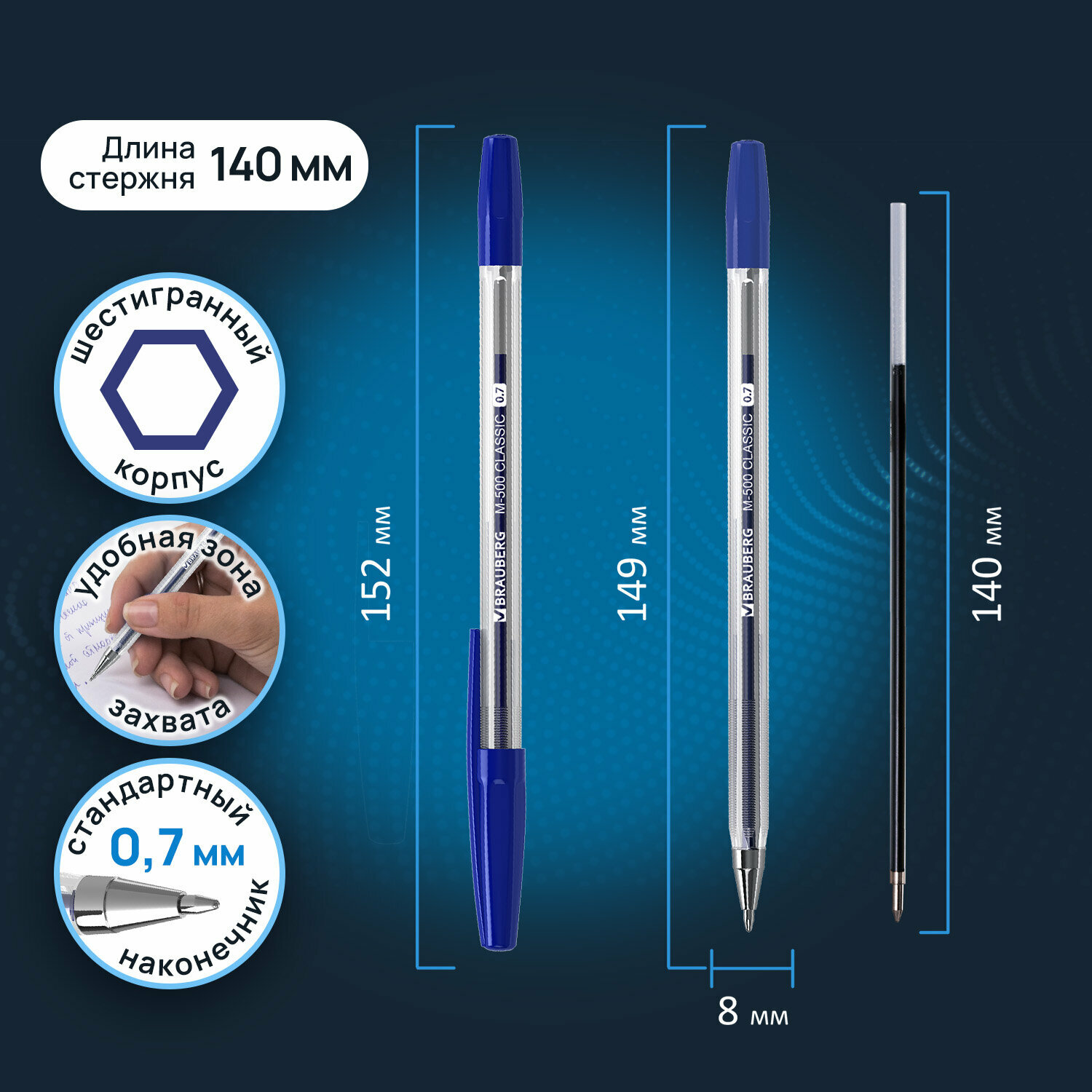 Ручки шариковые BRAUBERG "M-500", набор 10 шт., синие, узел 0,7 мм, линия письма 0,35 мм, 143454