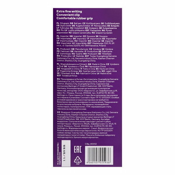 | Комплектация | 2 шариковые неавтоматические ручки |